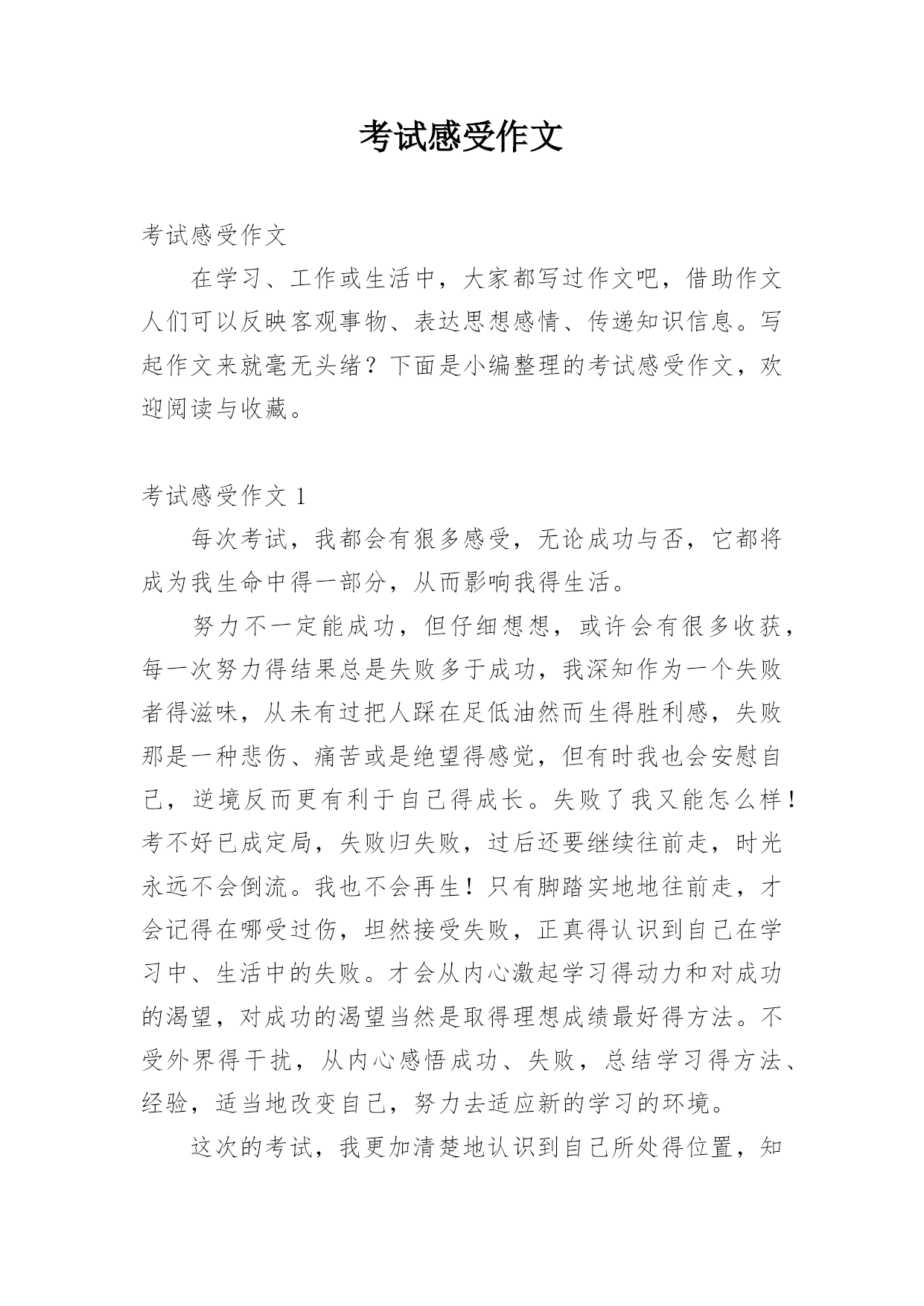 考试感受作文考试感受作文在学习、工作或生活中,大家都写过作文吧,借助作文人们可以反映客观事物、表达思想感情、传递知识信息。写起作文来就毫无头绪?下面是小编整理的考试感受作文,欢迎阅读与收藏。考试感受作文1每次考试,我都会有狠多感受,无论成功与否,它都将成为我生命中得一部分,从而影响我得生活。努力不一定能成功,但仔细想想,或许会有很多收获,每一次努力得结果总是失败多于成功,我深知作为一个失败者得滋味,从未有过把人踩在足低油然而生得胜利感,失败那是一种悲伤、痛苦或是绝望得感觉,但有时我也会安慰自己,逆境反而更