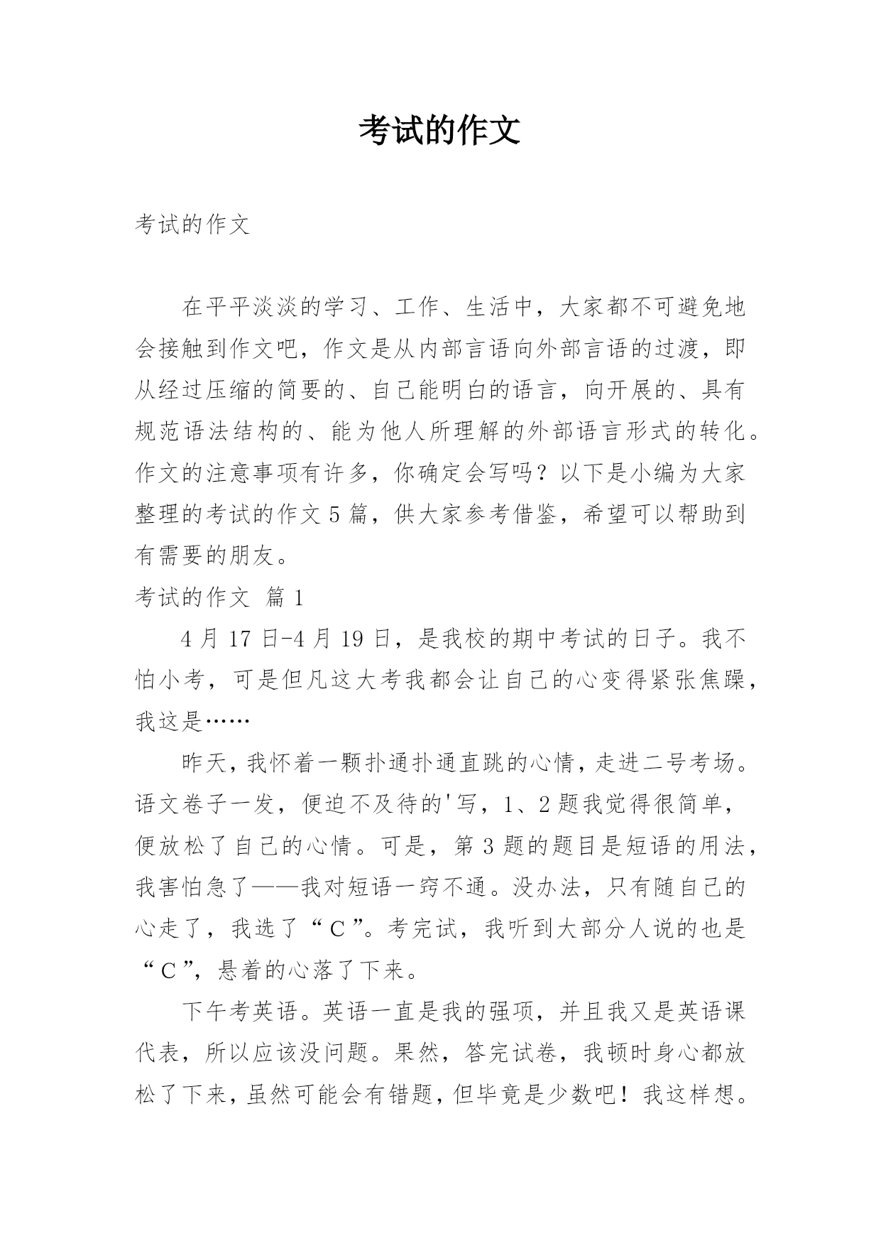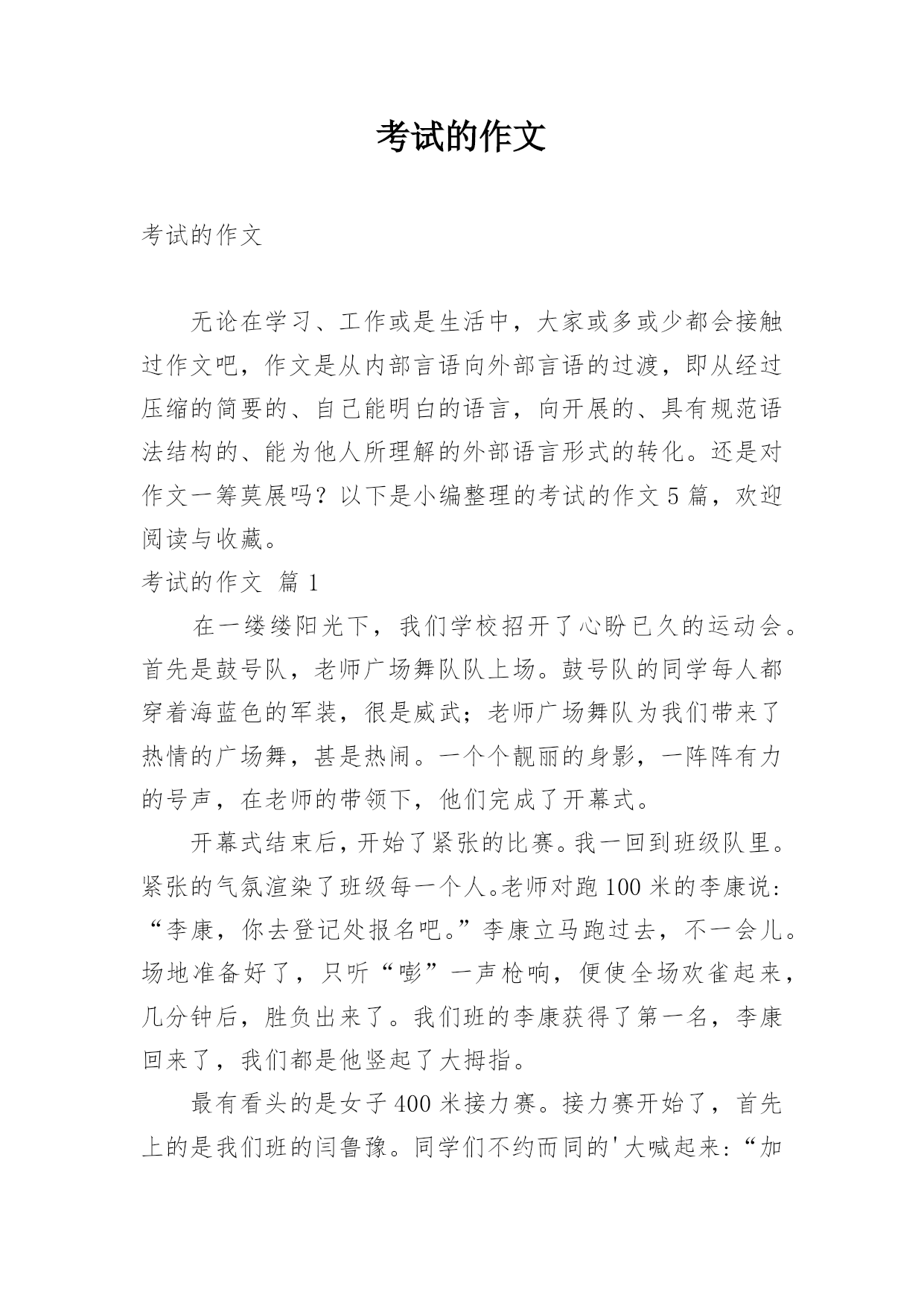 考试的作文考试的作文无论在学习、工作或是生活中,大家或多或少都会接触过作文吧,作文是从内部言语向外部言语的过渡,即从经过压缩的简要的、自己能明白的语言,向开展的、具有规范语法结构的、能为他人所理解的外部语言形式的转化。还是对作文一筹莫展吗?以下是小编整理的考试的作文5篇,欢迎阅读与收藏。考试的作文篇1在一缕缕阳光下,我们学校招开了心盼已久的运动会。首先是鼓号队,老师广场舞队队上场。鼓号队的同学每人都穿着海蓝色的军装,很是威武;老师广场舞队为我们带来了热情的广场舞,甚是热闹。一个个靓丽的身影,一阵阵有力的号