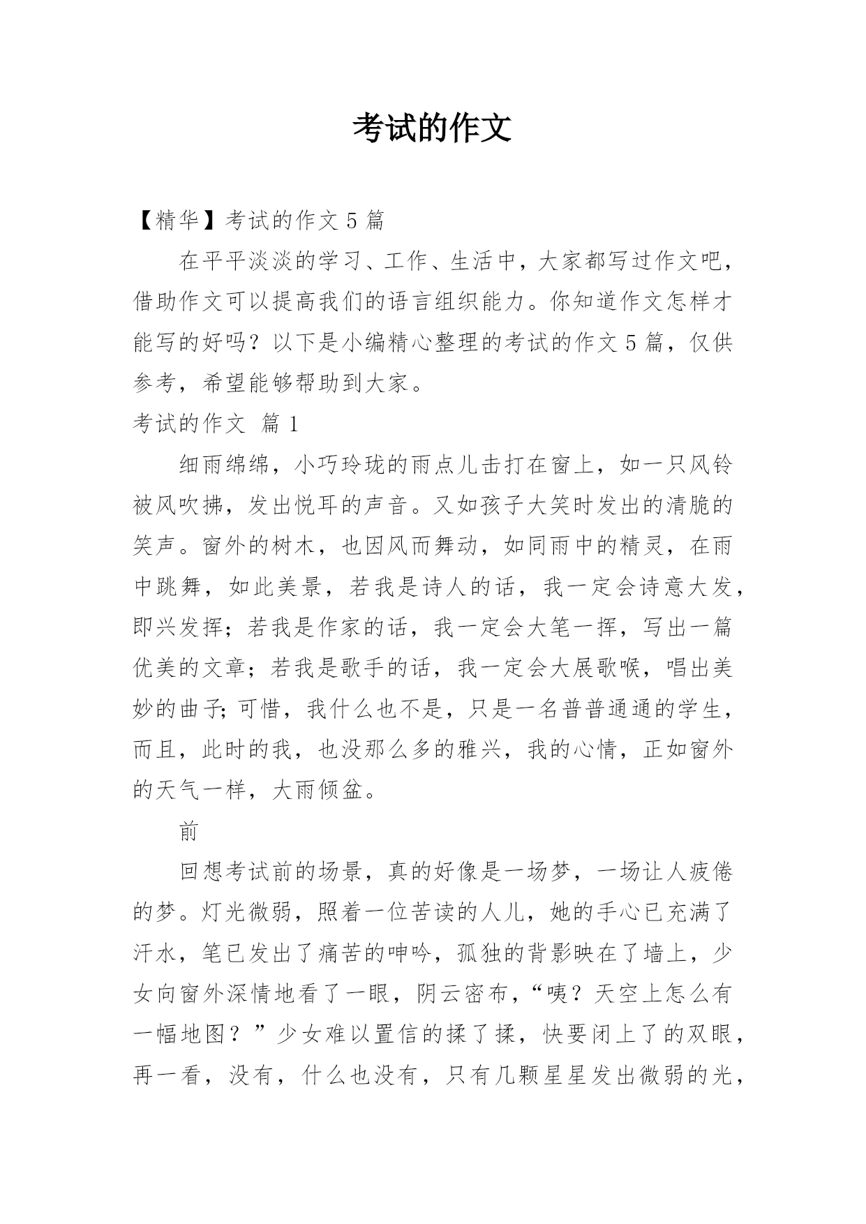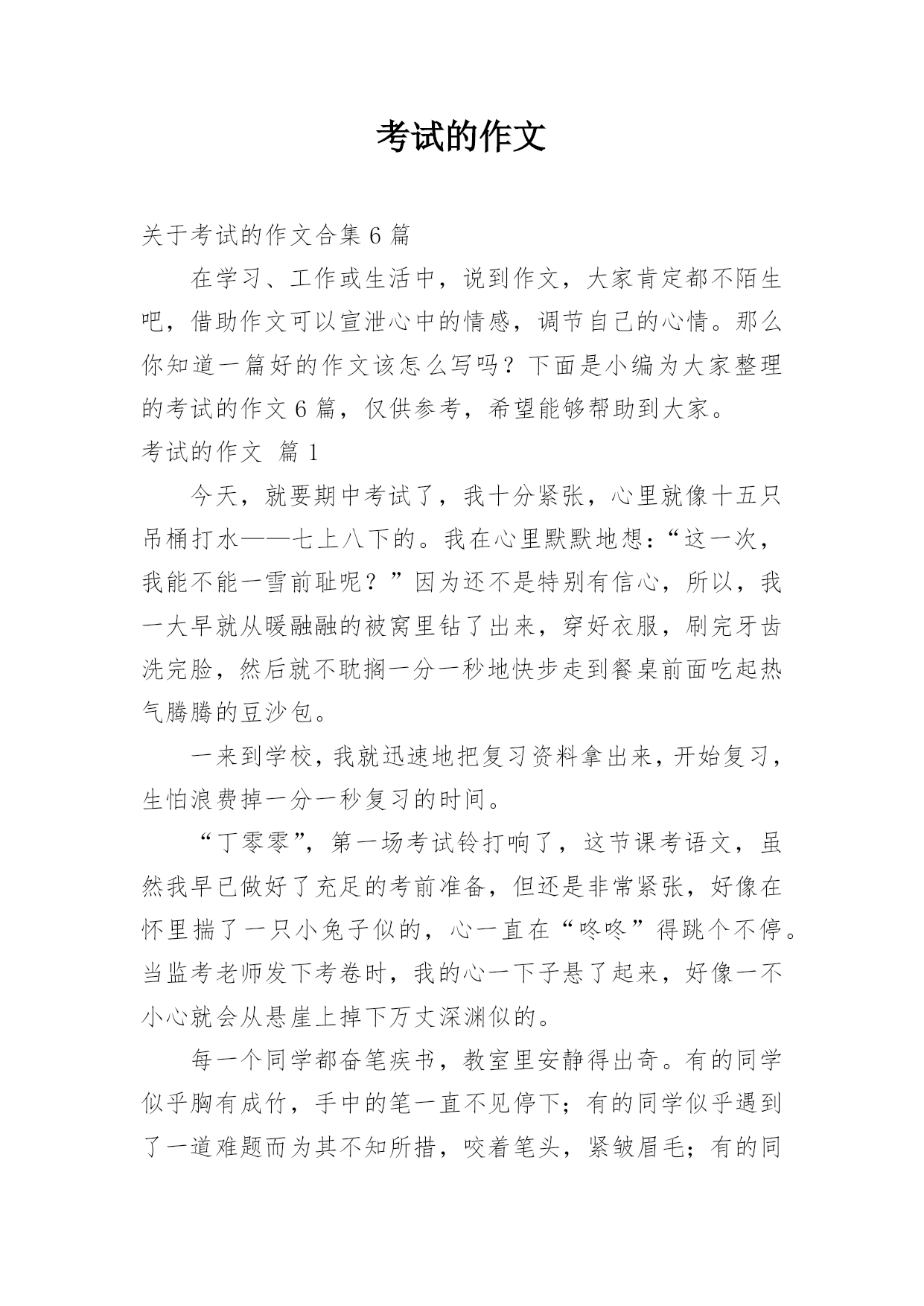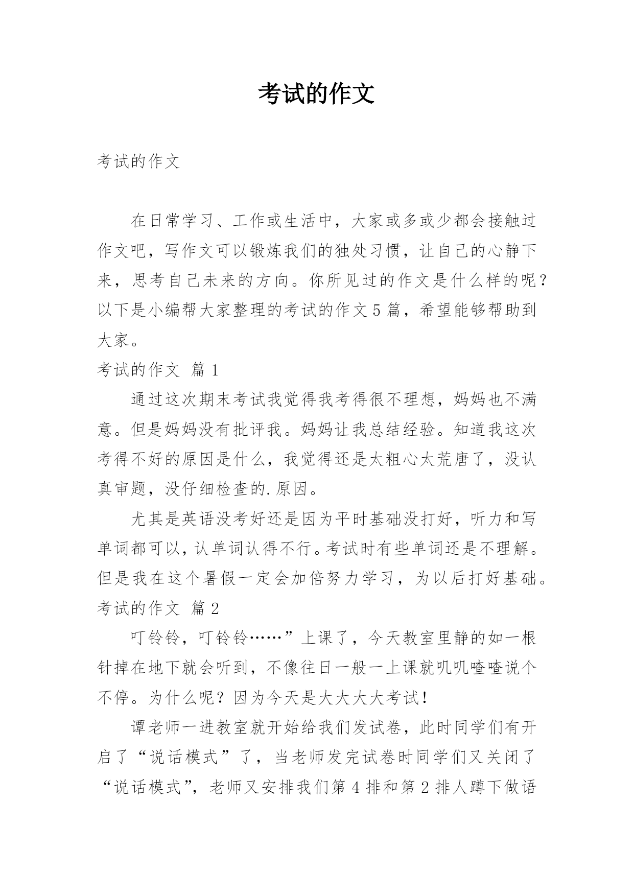 考试的作文考试的作文在日常学习、工作或生活中,大家或多或少都会接触过作文吧,写作文可以锻炼我们的独处习惯,让自己的心静下来,思考自己未来的方向。你所见过的作文是什么样的呢?以下是小编帮大家整理的考试的作文5篇,希望能够帮助到大家。考试的作文篇1通过这次期末考试我觉得我考得很不理想,妈妈也不满意。但是妈妈没有批评我。妈妈让我总结经验。知道我这次考得不好的原因是什么,我觉得还是太粗心太荒唐了,没认真审题,没仔细检查的.原因。尤其是英语没考好还是因为平时基础没打好,听力和写单词都可以,认单词认得不行。考试时有些
