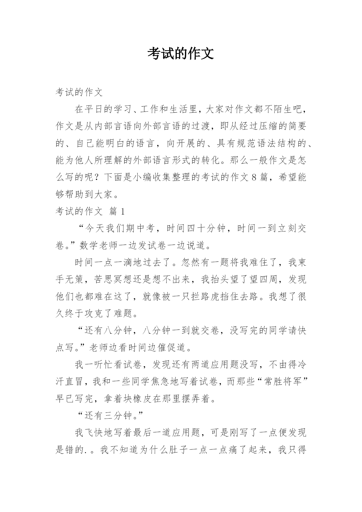考试的作文考试的作文在平日的学习、工作和生活里,大家对作文都不陌生吧,作文是从内部言语向外部言语的过渡,即从经过压缩的简要的、自己能明白的语言,向开展的、具有规范语法结构的、能为他人所理解的外部语言形式的转化。那么一般作文是怎么写的呢?下面是小编收集整理的考试的作文8篇,希望能够帮助到大家。考试的作文篇1“今天我们期中考,时间四十分钟,时间一到立刻交卷。”数学老师一边发试卷一边说道。时间一点一滴地过去了。忽然有一题将我难住了,我束手无策,苦思冥想还是想不出来,我抬头望了望四周,发现他们也都难在这了,就像被