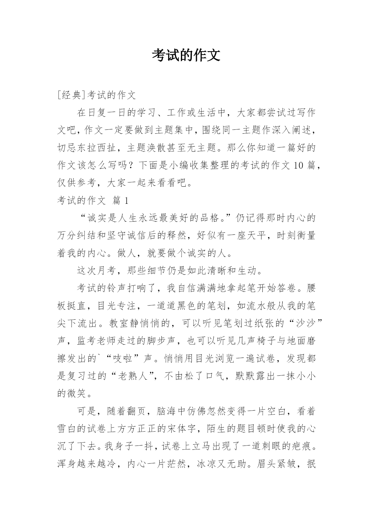 考试的作文[经典]考试的作文在日复一日的学习、工作或生活中,大家都尝试过写作文吧,作文一定要做到主题集中,围绕同一主题作深入阐述,切忌东拉西扯,主题涣散甚至无主题。那么你知道一篇好的作文该怎么写吗?下面是小编收集整理的考试的作文10篇,仅供参考,大家一起来看看吧。考试的作文篇1“诚实是人生永远最美好的品格。”仍记得那时内心的万分纠结和坚守诚信后的释然,好似有一座天平,时刻衡量着我的内心。做人,就要做个诚实的人。这次月考,那些细节仍是如此清晰和生动。考试的铃声打响了,我自信满满地拿起笔开始答卷。腰板挺直,目