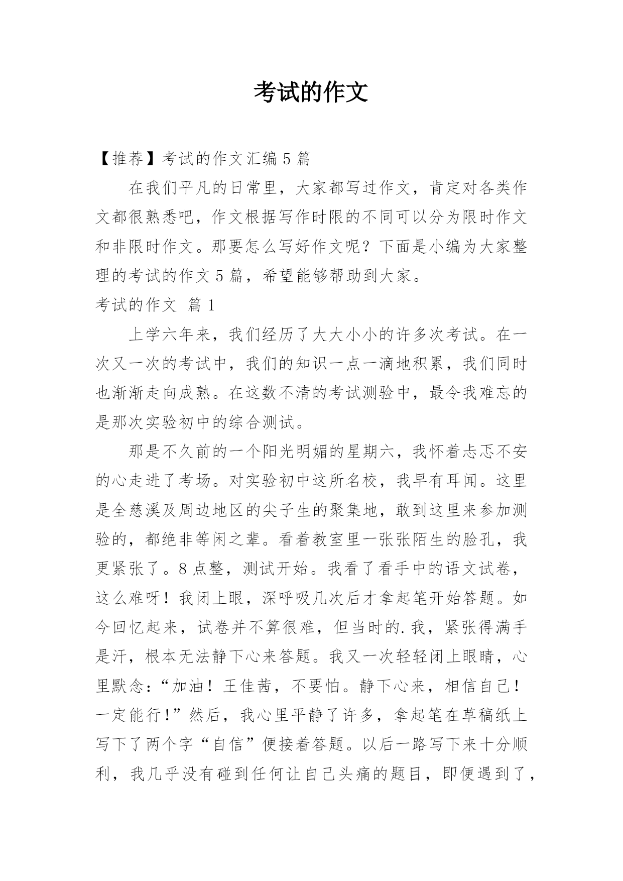 考试的作文【推荐】考试的作文汇编5篇在我们平凡的日常里,大家都写过作文,肯定对各类作文都很熟悉吧,作文根据写作时限的不同可以分为限时作文和非限时作文。那要怎么写好作文呢?下面是小编为大家整理的考试的作文5篇,希望能够帮助到大家。考试的作文篇1上学六年来,我们经历了大大小小的许多次考试。在一次又一次的考试中,我们的知识一点一滴地积累,我们同时也渐渐走向成熟。在这数不清的考试测验中,最令我难忘的是那次实验初中的综合测试。那是不久前的一个阳光明媚的星期六,我怀着忐忑不安的心走进了考场。对实验初中这所名校,我早有