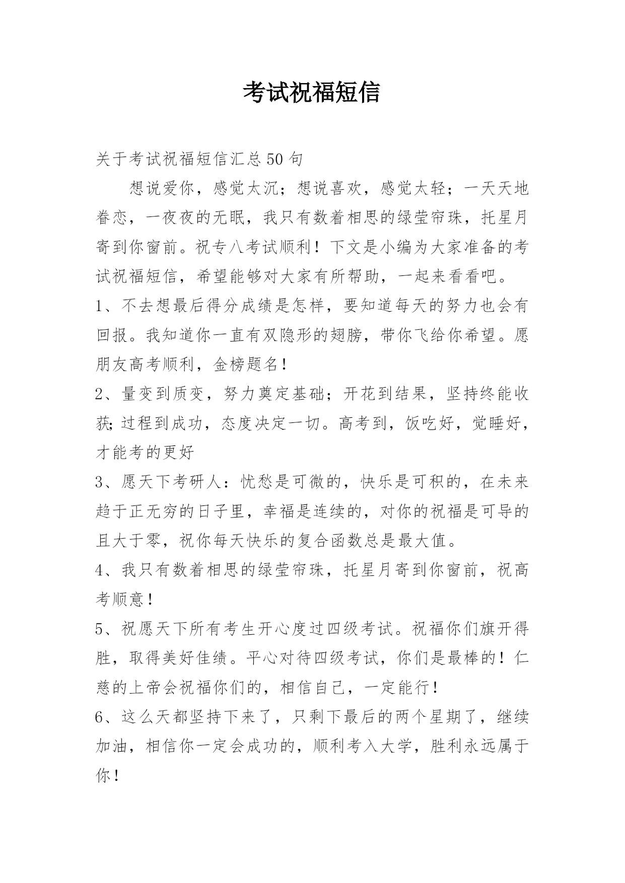 考试祝福短信关于考试祝福短信汇总50句想说爱你,感觉太沉;想说喜欢,感觉太轻;一天天地眷恋,一夜夜的无眠,我只有数着相思的绿莹帘珠,托星月寄到你窗前。祝专八考试顺利!下文是小编为大家准备的考试祝福短信,希望能够对大家有所帮助,一起来看看吧。1、不去想最后得分成绩是怎样,要知道每天的努力也会有回报。我知道你一直有双隐形的翅膀,带你飞给你希望。愿朋友高考顺利,金榜题名!2、量变到质变,努力奠定基础;开花到结果,坚持终能收获;过程到成功,态度决定一切。高考到,饭吃好,觉睡好,才能考的更好3、愿天下考研人:忧愁是