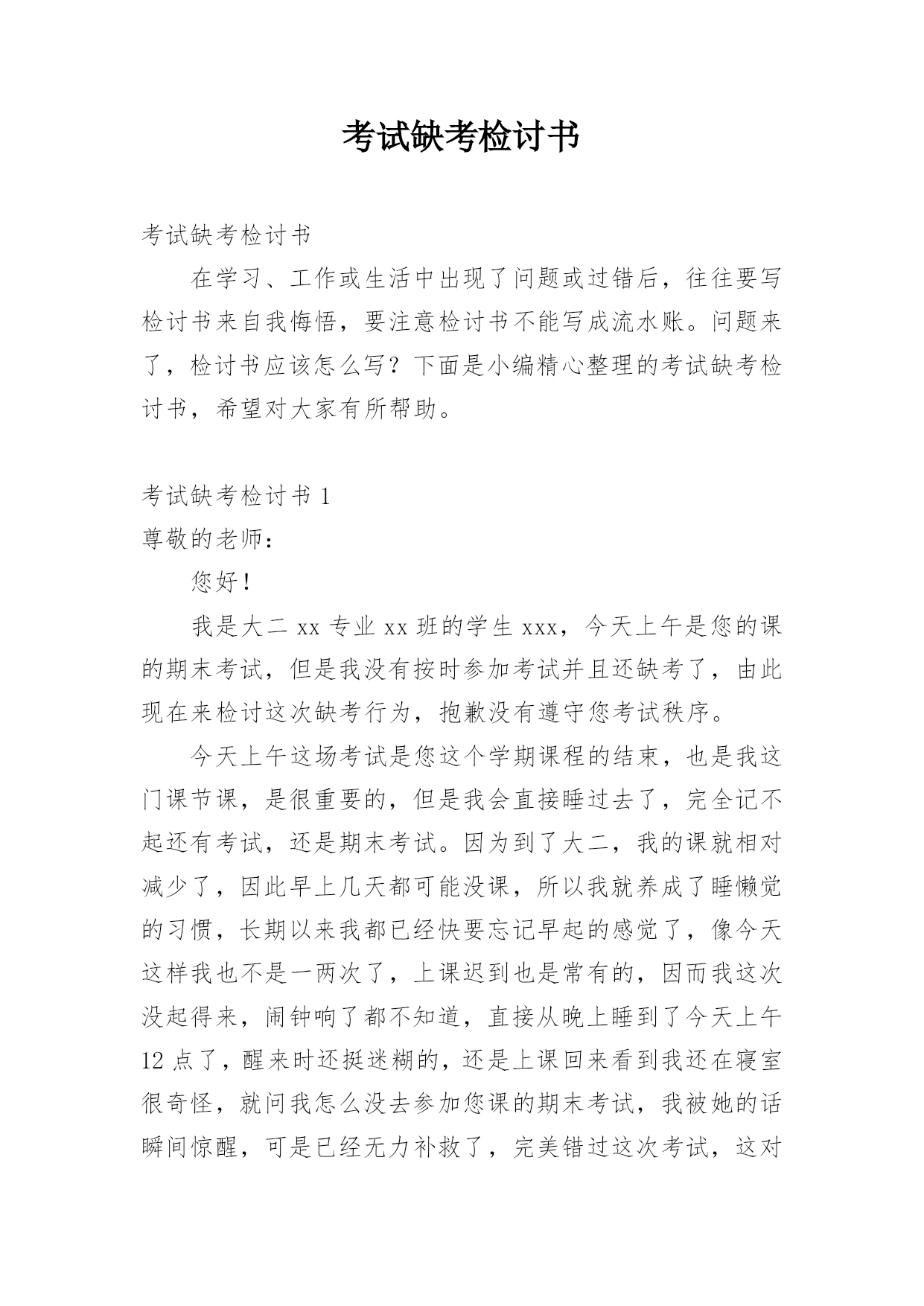 考试缺考检讨书考试缺考检讨书在学习、工作或生活中出现了问题或过错后,往往要写检讨书来自我悔悟,要注意检讨书不能写成流水账。问题来了,检讨书应该怎么写?下面是小编精心整理的考试缺考检讨书,希望对大家有所帮助。考试缺考检讨书1尊敬的老师:您好!我是大二xx专业xx班的学生xxx,今天上午是您的课的期末考试,但是我没有按时参加考试并且还缺考了,由此现在来检讨这次缺考行为,抱歉没有遵守您考试秩序。今天上午这场考试是您这个学期课程的结束,也是我这门课节课,是很重要的,但是我会直接睡过去了,完全记不起还有考试,还是期