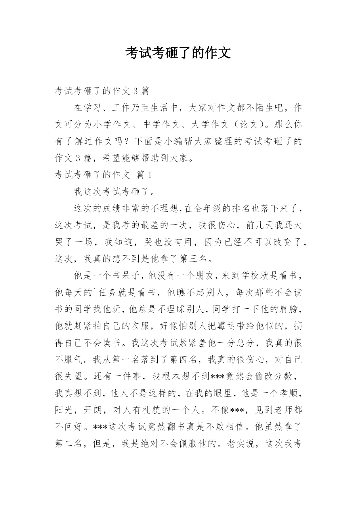 考试考砸了的作文考试考砸了的作文3篇在学习、工作乃至生活中,大家对作文都不陌生吧,作文可分为小学作文、中学作文、大学作文(论文)。那么你有了解过作文吗?下面是小编帮大家整理的考试考砸了的作文3篇,希望能够帮助到大家。考试考砸了的作文篇1我这次考试考砸了。这次的成绩非常的不理想,在全年级的排名也落下来了,这次考试,是我考的最差的一次,我很伤心,前几天我还大哭了一场,我知道,哭也没有用,因为已经不可以改变了,这次,我真的想不到是他拿了第三名。他是一个书呆子,他没有一个朋友,来到学校就是看书,他每天的`任务就是