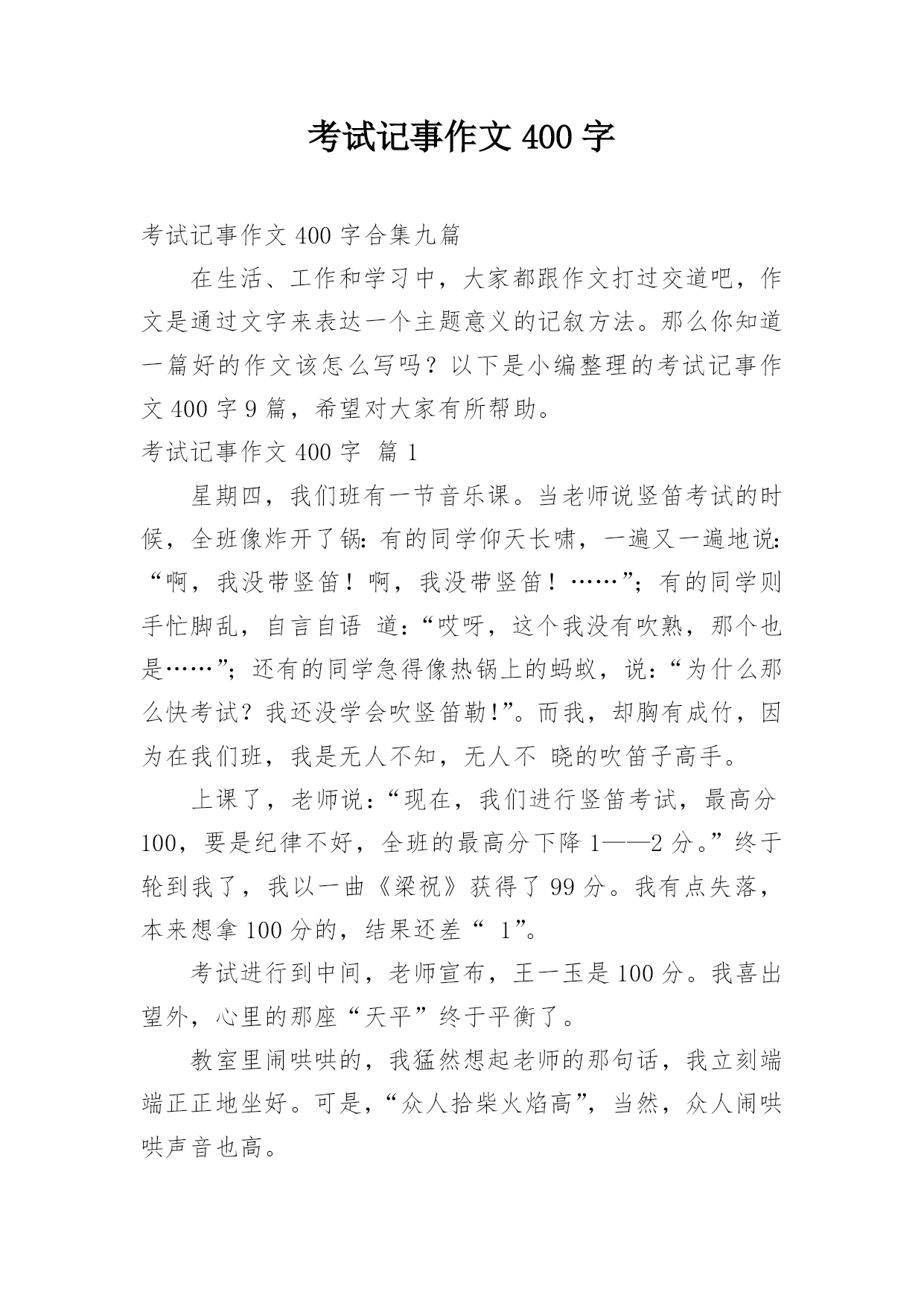 考试记事作文400字考试记事作文400字合集九篇在生活、工作和学习中,大家都跟作文打过交道吧,作文是通过文字来表达一个主题意义的记叙方法。那么你知道一篇好的作文该怎么写吗?以下是小编整理的考试记事作文400字9篇,希望对大家有所帮助。考试记事作文400字篇1星期四,我们班有一节音乐课。当老师说竖笛考试的时候,全班像炸开了锅:有的同学仰天长啸,一遍又一遍地说:“啊,我没带竖笛!啊,我没带竖笛!……”;有的同学则手忙脚乱,自言自语道:“哎呀,这个我没有吹熟,那个也是……”;还有的同学急得像热锅上的蚂蚁,说:“
