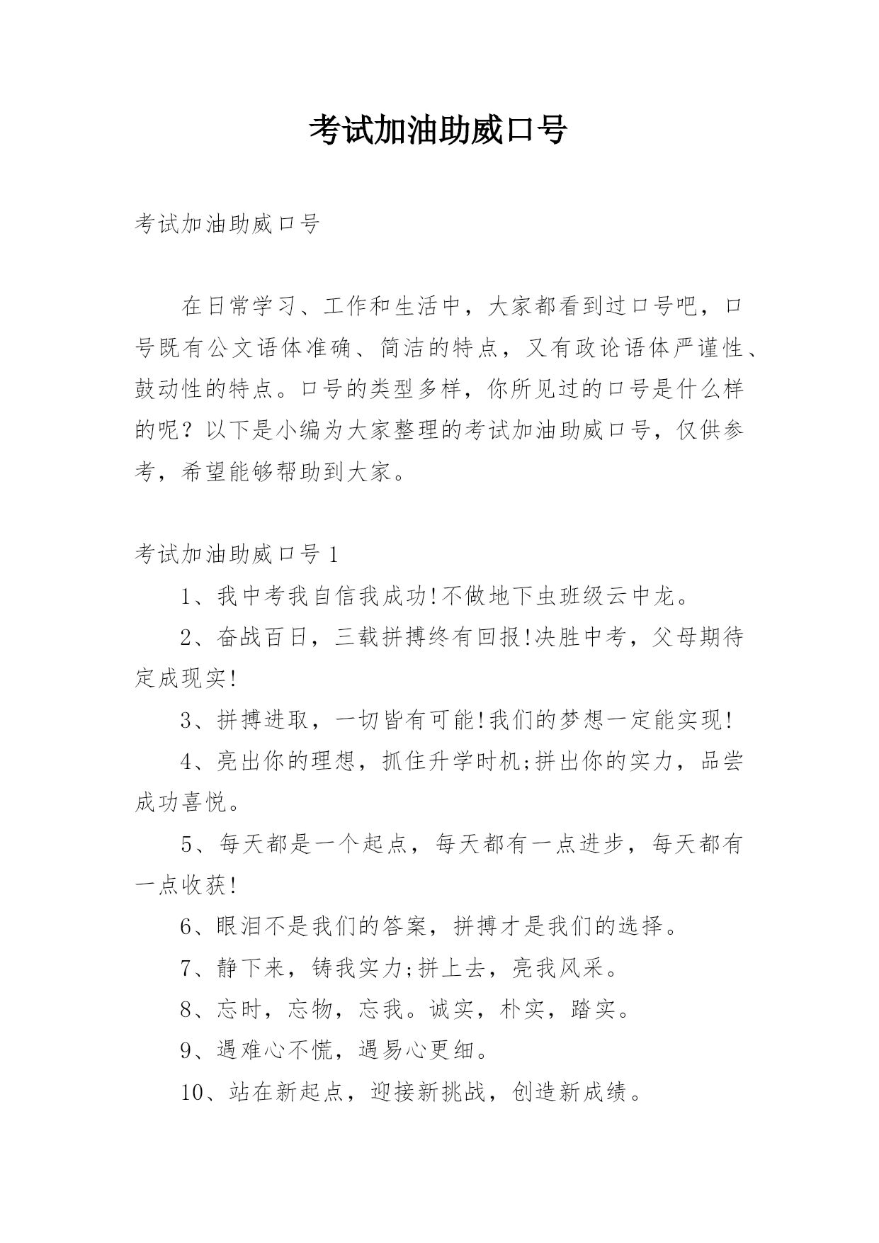考试加油助威口号考试加油助威口号在日常学习、工作和生活中,大家都看到过口号吧,口号既有公文语体准确、简洁的特点,又有政论语体严谨性、鼓动性的特点。口号的类型多样,你所见过的口号是什么样的呢?以下是小编为大家整理的考试加油助威口号,仅供参考,希望能够帮助到大家。考试加油助威口号11、我中考我自信我成功!不做地下虫班级云中龙。2、奋战百日,三载拼搏终有回报!决胜中考,父母期待定成现实!3、拼搏进取,一切皆有可能!我们的梦想一定能实现!4、亮出你的理想,抓住升学时机;拼出你的实力,品尝成功喜悦。5、每天都是一个