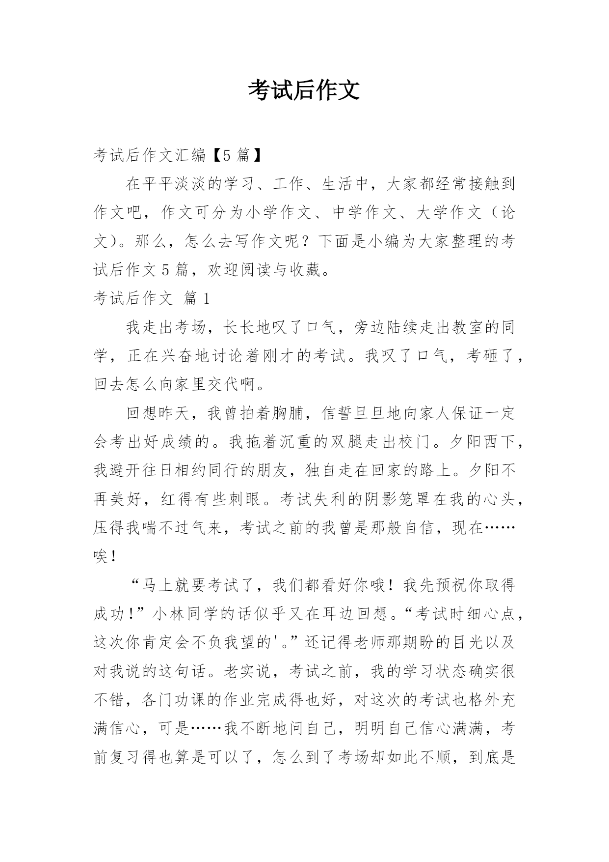考试后作文考试后作文汇编【5篇】在平平淡淡的学习、工作、生活中,大家都经常接触到作文吧,作文可分为小学作文、中学作文、大学作文(论文)。那么,怎么去写作文呢?下面是小编为大家整理的考试后作文5篇,欢迎阅读与收藏。考试后作文篇1我走出考场,长长地叹了口气,旁边陆续走出教室的同学,正在兴奋地讨论着刚才的考试。我叹了口气,考砸了,回去怎么向家里交代啊。回想昨天,我曾拍着胸脯,信誓旦旦地向家人保证一定会考出好成绩的。我拖着沉重的双腿走出校门。夕阳西下,我避开往日相约同行的朋友,独自走在回家的路上。夕阳不再美好,红