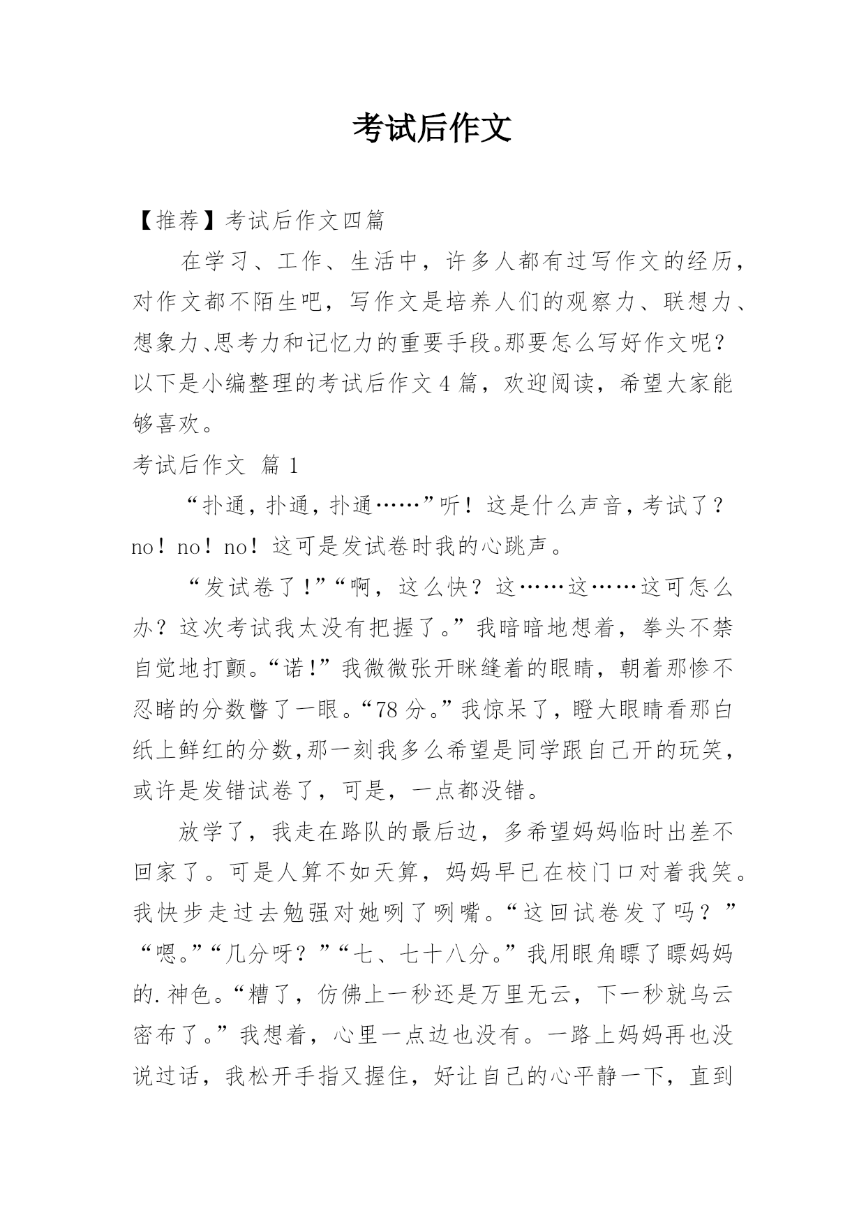 考试后作文【推荐】考试后作文四篇在学习、工作、生活中,许多人都有过写作文的经历,对作文都不陌生吧,写作文是培养人们的观察力、联想力、想象力、思考力和记忆力的重要手段。那要怎么写好作文呢?以下是小编整理的考试后作文4篇,欢迎阅读,希望大家能够喜欢。考试后作文篇1“扑通,扑通,扑通……”听!这是什么声音,考试了?no!no!no!这可是发试卷时我的心跳声。“发试卷了!”“啊,这么快?这……这……这可怎么办?这次考试我太没有把握了。”我暗暗地想着,拳头不禁自觉地打颤。“诺!”我微微张开眯缝着的眼睛,朝着那惨不忍