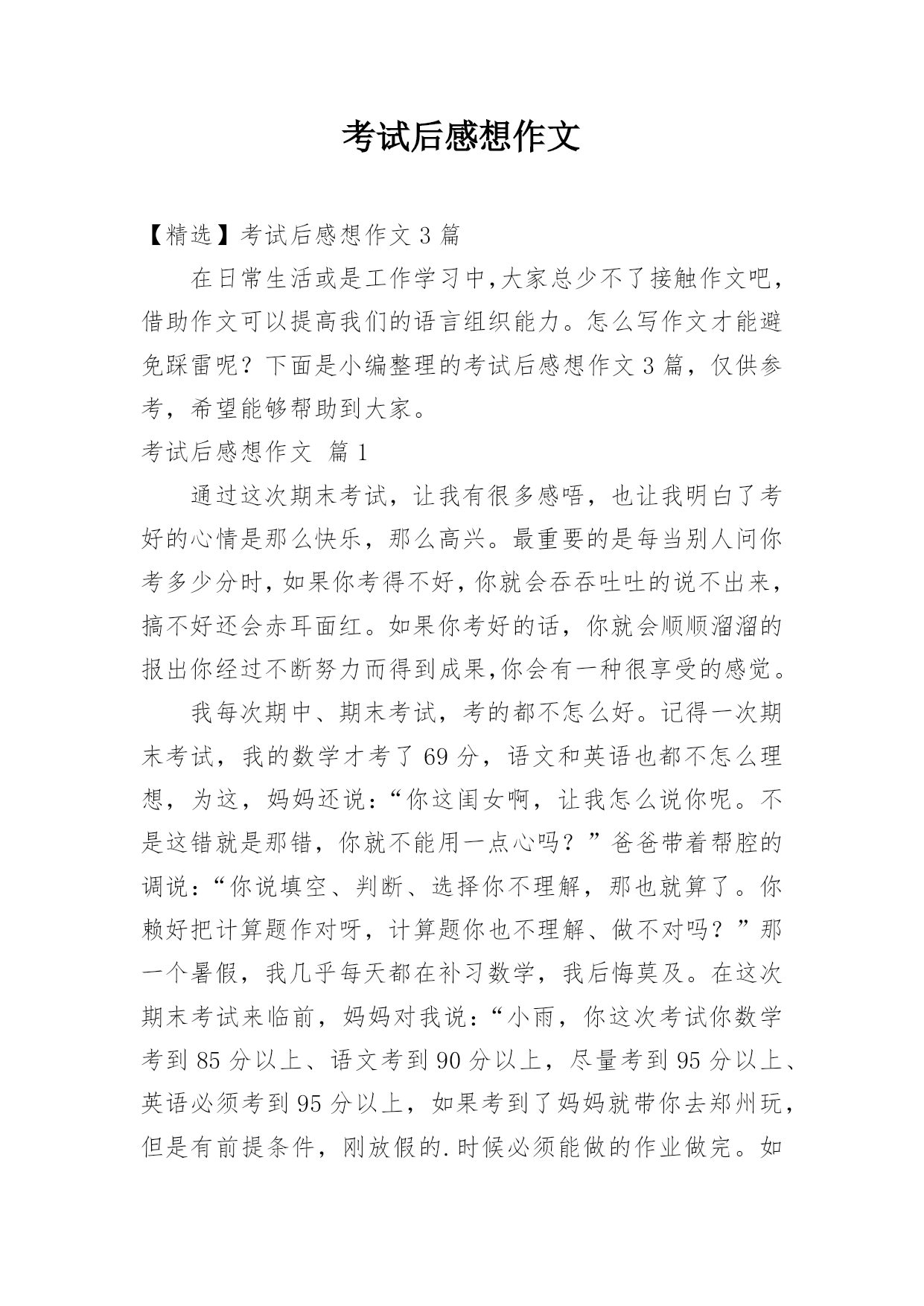 考试后感想作文【精选】考试后感想作文3篇在日常生活或是工作学习中,大家总少不了接触作文吧,借助作文可以提高我们的语言组织能力。怎么写作文才能避免踩雷呢?下面是小编整理的考试后感想作文3篇,仅供参考,希望能够帮助到大家。考试后感想作文篇1通过这次期末考试,让我有很多感唔,也让我明白了考好的心情是那么快乐,那么高兴。最重要的是每当别人问你考多少分时,如果你考得不好,你就会吞吞吐吐的说不出来,搞不好还会赤耳面红。如果你考好的话,你就会顺顺溜溜的报出你经过不断努力而得到成果,你会有一种很享受的感觉。我每次期中、期