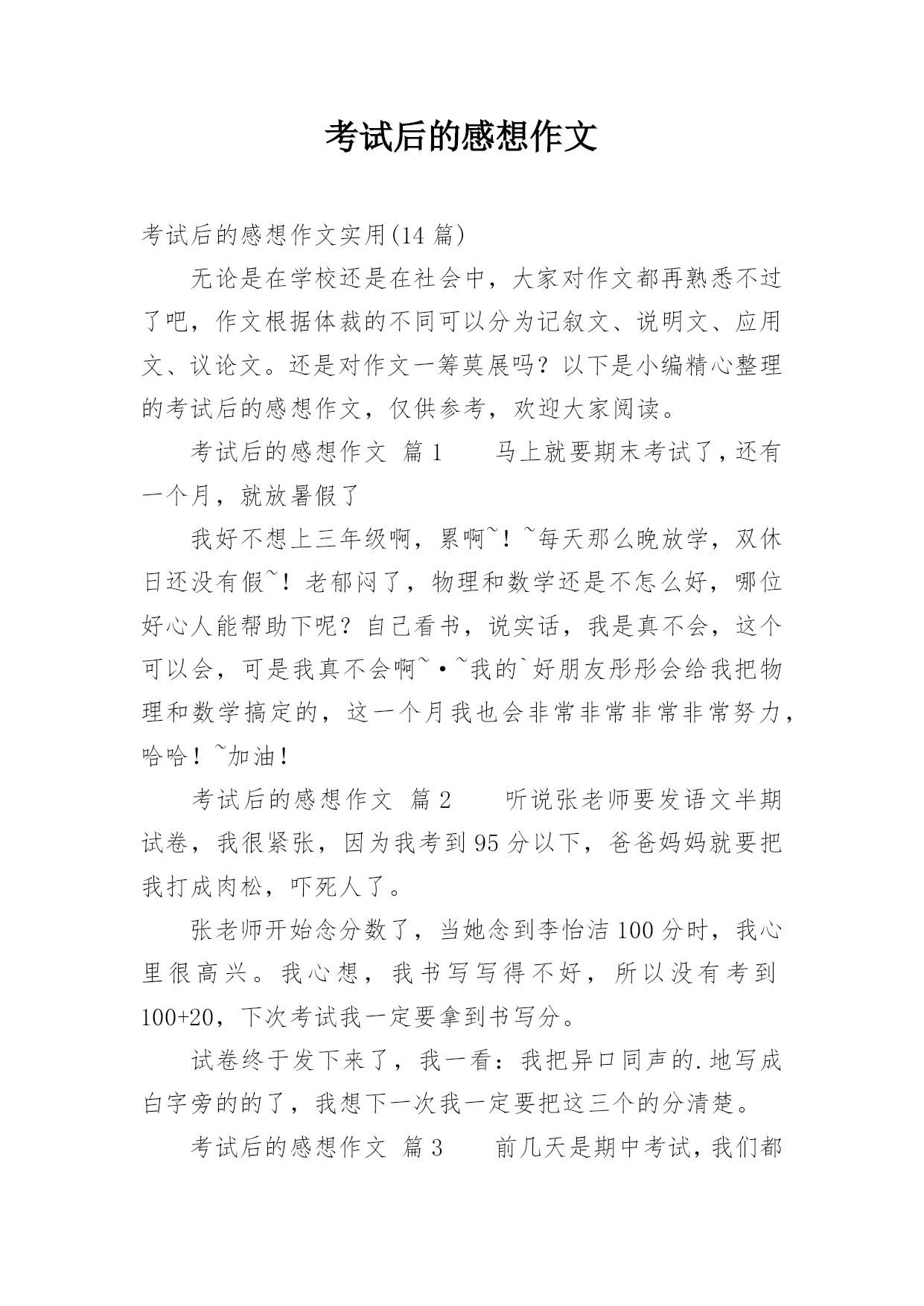考试后的感想作文考试后的感想作文实用(14篇)无论是在学校还是在社会中,大家对作文都再熟悉不过了吧,作文根据体裁的不同可以分为记叙文、说明文、应用文、议论文。还是对作文一筹莫展吗?以下是小编精心整理的考试后的感想作文,仅供参考,欢迎大家阅读。考试后的感想作文篇1马上就要期末考试了,还有一个月,就放暑假了我好不想上三年级啊,累啊~!~每天那么晚放学,双休日还没有假~!老郁闷了,物理和数学还是不怎么好,哪位好心人能帮助下呢?自己看书,说实话,我是真不会,这个可以会,可是我真不会啊~·~我的`好朋友彤彤会给我把