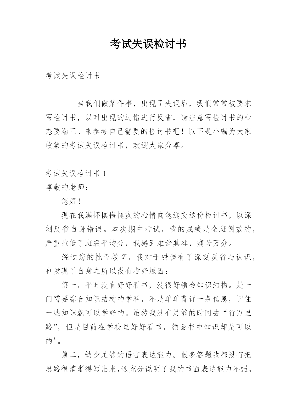 考试失误检讨书考试失误检讨书当我们做某件事,出现了失误后,我们常常被要求写检讨书,以对出现的过错进行反省,请注意写检讨书的心态要端正。来参考自己需要的检讨书吧!以下是小编为大家收集的考试失误检讨书,欢迎大家分享。考试失误检讨书1尊敬的老师:您好!现在我满怀懊悔愧疚的心情向您递交这份检讨书,以深刻反省自身错误。本次期中考试,我的成绩是全班倒数的,严重拉低了班级平均分,我感到难辞其咎,痛苦万分。经过您的批评教育,我对于错误有了深刻反省与认识,也发现了自身之所以没有考好原因:第一,平时没有好好看书,没很好领会知