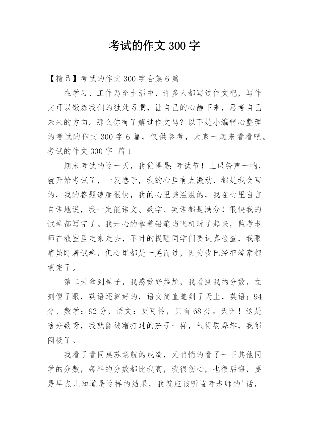 考试的作文300字【精品】考试的作文300字合集6篇在学习、工作乃至生活中,许多人都写过作文吧,写作文可以锻炼我们的独处习惯,让自己的心静下来,思考自己未来的方向。那么你有了解过作文吗?以下是小编精心整理的考试的作文300字6篇,仅供参考,大家一起来看看吧。考试的作文300字篇1期末考试的这一天,我觉得是:考试节!上课铃声一响,就开始考试了,一发卷子,我的心里有点激动,都是我会写的,我的答题速度很快,我的心里美滋滋的,我在心里自言自语地说,我一定能语文、数学、英语都是满分!很快我的试卷都写完了。我开心的拿