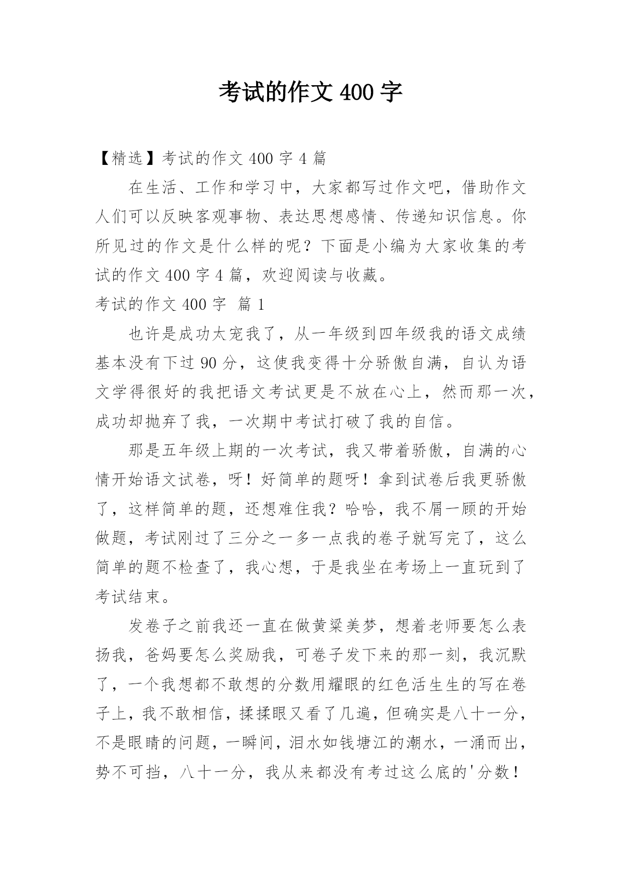 考试的作文400字【精选】考试的作文400字4篇在生活、工作和学习中,大家都写过作文吧,借助作文人们可以反映客观事物、表达思想感情、传递知识信息。你所见过的作文是什么样的呢?下面是小编为大家收集的考试的作文400字4篇,欢迎阅读与收藏。考试的作文400字篇1也许是成功太宠我了,从一年级到四年级我的语文成绩基本没有下过90分,这使我变得十分骄傲自满,自认为语文学得很好的我把语文考试更是不放在心上,然而那一次,成功却抛弃了我,一次期中考试打破了我的自信。那是五年级上期的一次考试,我又带着骄傲,自满的心情开始语