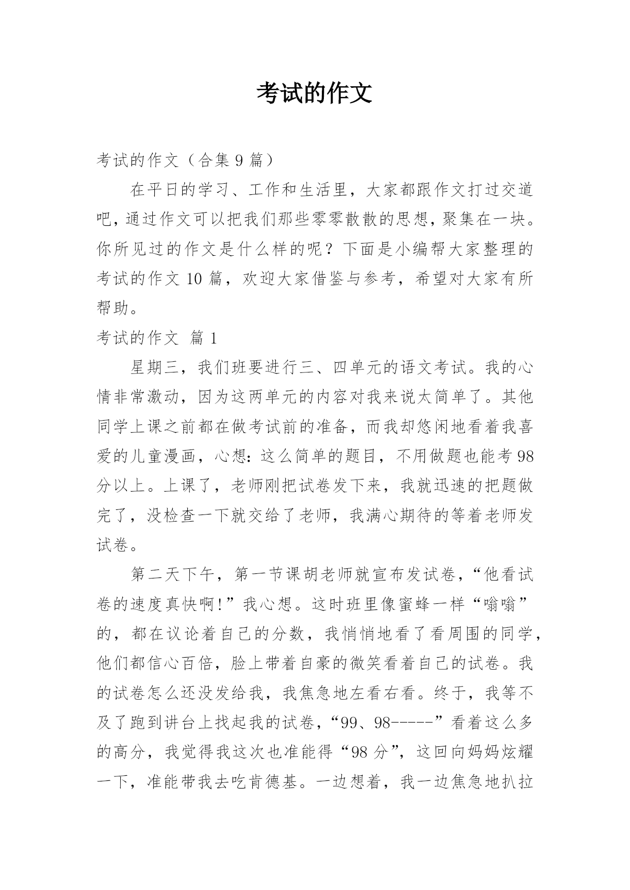 考试的作文考试的作文(合集9篇)在平日的学习、工作和生活里,大家都跟作文打过交道吧,通过作文可以把我们那些零零散散的思想,聚集在一块。你所见过的作文是什么样的呢?下面是小编帮大家整理的考试的作文10篇,欢迎大家借鉴与参考,希望对大家有所帮助。考试的作文篇1星期三,我们班要进行三、四单元的语文考试。我的心情非常激动,因为这两单元的内容对我来说太简单了。其他同学上课之前都在做考试前的准备,而我却悠闲地看着我喜爱的儿童漫画,心想:这么简单的题目,不用做题也能考98分以上。上课了,老师刚把试卷发下来,我就迅速的把