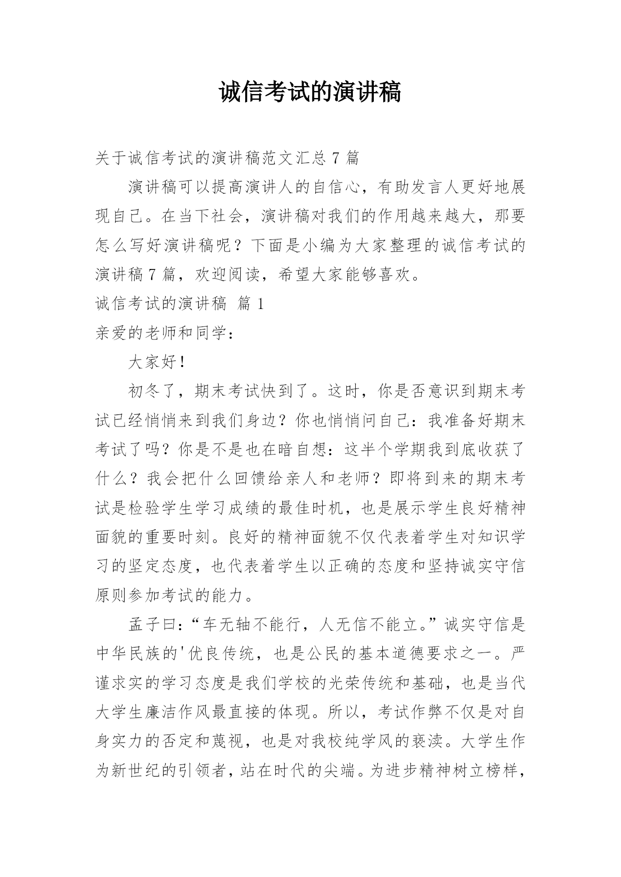 诚信考试的演讲稿关于诚信考试的演讲稿范文汇总7篇演讲稿可以提高演讲人的自信心,有助发言人更好地展现自己。在当下社会,演讲稿对我们的作用越来越大,那要怎么写好演讲稿呢?下面是小编为大家整理的诚信考试的演讲稿7篇,欢迎阅读,希望大家能够喜欢。诚信考试的演讲稿篇1亲爱的老师和同学:大家好!初冬了,期末考试快到了。这时,你是否意识到期末考试已经悄悄来到我们身边?你也悄悄问自己:我准备好期末考试了吗?你是不是也在暗自想:这半个学期我到底收获了什么?我会把什么回馈给亲人和老师?即将到来的期末考试是检验学生学习成绩的最