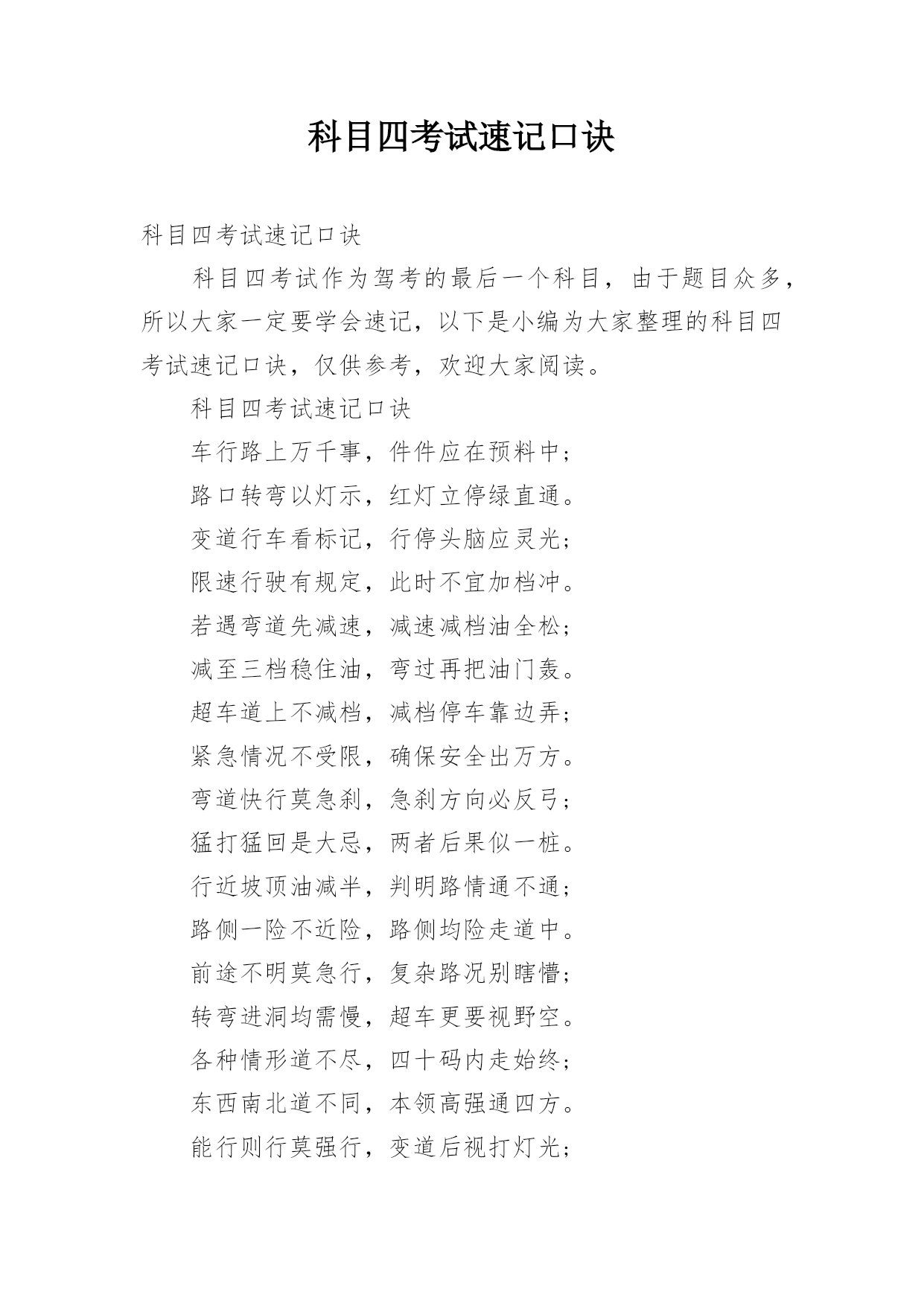 科目四考试速记口诀科目四考试速记口诀科目四考试作为驾考的最后一个科目,由于题目众多,所以大家一定要学会速记,以下是小编为大家整理的科目四考试速记口诀,仅供参考,欢迎大家阅读。科目四考试速记口诀车行路上万千事,件件应在预料中;路口转弯以灯示,红灯立停绿直通。变道行车看标记,行停头脑应灵光;限速行驶有规定,此时不宜加档冲。若遇弯道先减速,减速减档油全松;减至三档稳住油,弯过再把油门轰。超车道上不减档,减档停车靠边弄;紧急情况不受限,确保安全出万方。弯道快行莫急刹,急刹方向必反弓;猛打猛回是大忌,两者后果似一桩