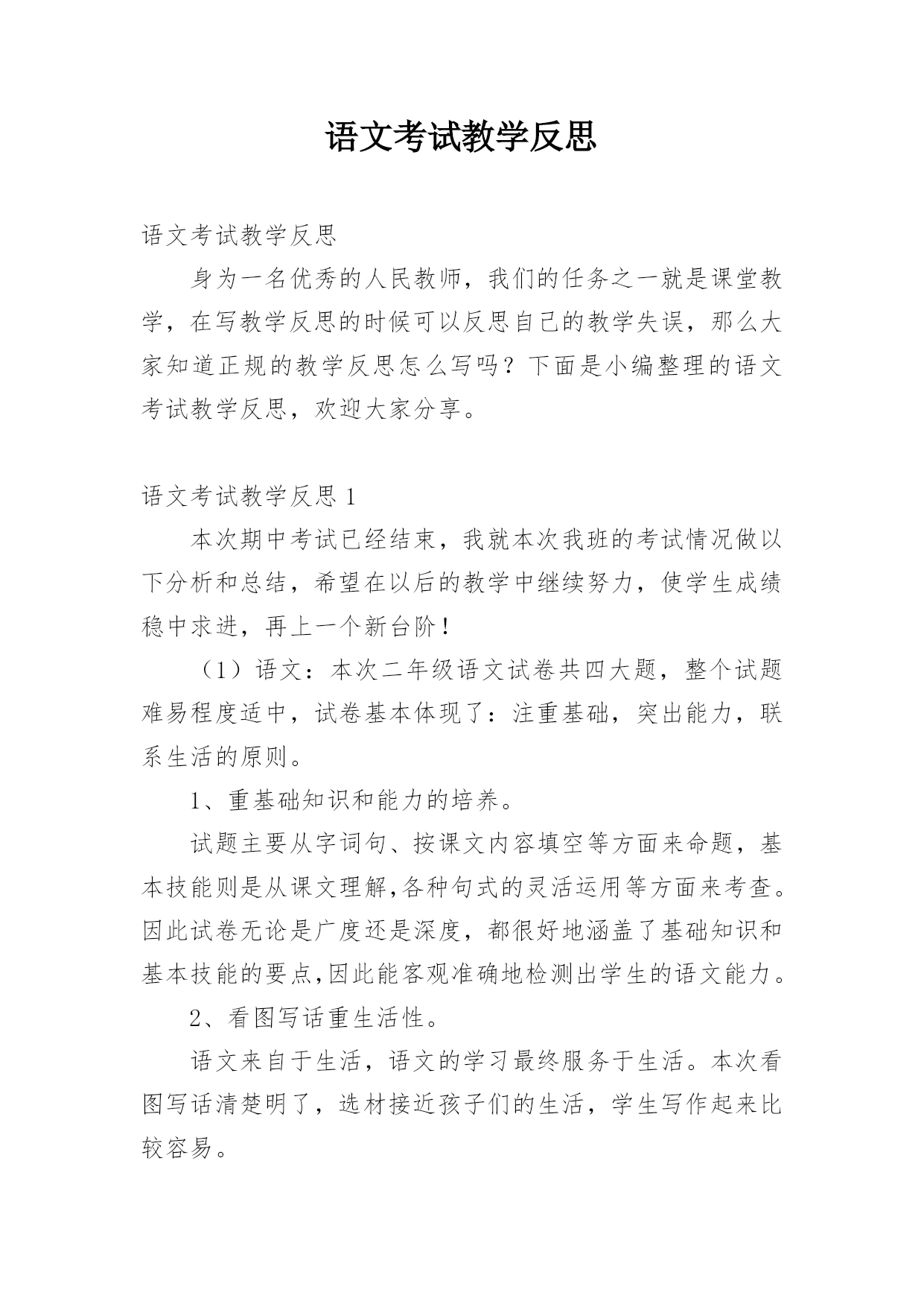 语文考试教学反思语文考试教学反思身为一名优秀的人民教师,我们的任务之一就是课堂教学,在写教学反思的时候可以反思自己的教学失误,那么大家知道正规的教学反思怎么写吗?下面是小编整理的语文考试教学反思,欢迎大家分享。语文考试教学反思1本次期中考试已经结束,我就本次我班的考试情况做以下分析和总结,希望在以后的教学中继续努力,使学生成绩稳中求进,再上一个新台阶!(1)语文:本次二年级语文试卷共四大题,整个试题难易程度适中,试卷基本体现了:注重基础,突出能力,联系生活的原则。1、重基础知识和能力的培养。试题主要从字词