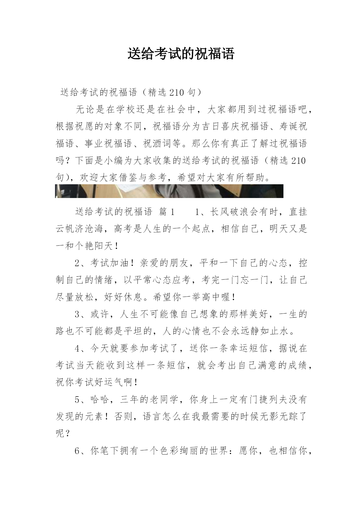 送给考试的祝福语送给考试的祝福语(精选210句)无论是在学校还是在社会中,大家都用到过祝福语吧,根据祝愿的对象不同,祝福语分为吉日喜庆祝福语、寿诞祝福语、事业祝福语、祝酒词等。那么你有真正了解过祝福语吗?下面是小编为大家收集的送给考试的祝福语(精选210句),欢迎大家借鉴与参考,希望对大家有所帮助。送给考试的祝福语篇11、长风破浪会有时,直挂云帆济沧海,高考是人生的一个起点,相信自己,明天又是一和个艳阳天!2、考试加油!亲爱的朋友,平和一下自己的心态,控制自己的情绪,以平常心态应考,考完一门忘一门,让自己