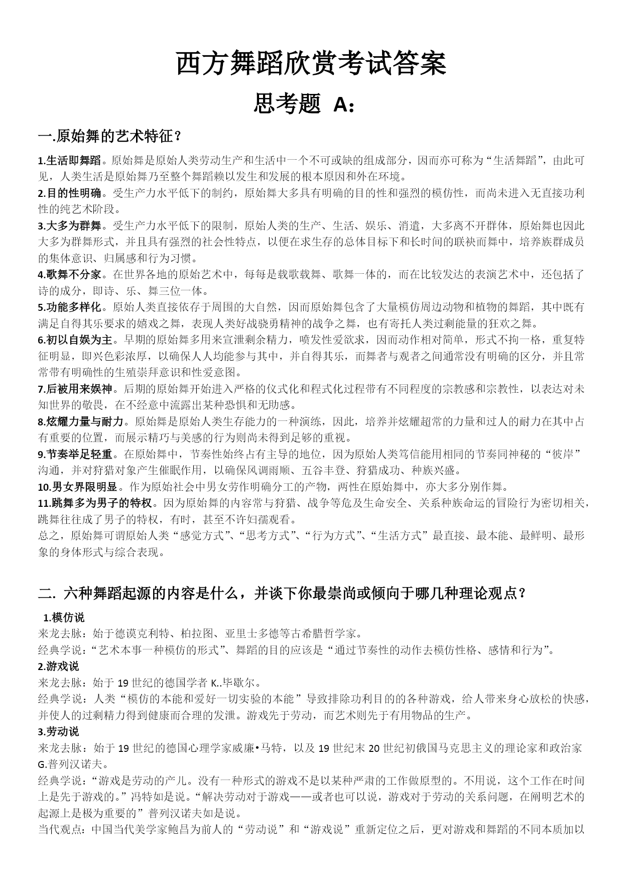 西方舞蹈欣赏考试答案思考题A:一.原始舞的艺术特征?1.生活即舞蹈。原始舞是原始人类劳动生产和生活中一个不可或缺的组成部分,因而亦可称为“生活舞蹈”,由此可见,人类生活是原始舞乃至整个舞蹈赖以发生和发展的根本原因和外在环境。2.目的性明确。受生产力水平低下的制约,原始舞大多具有明确的目的性和强烈的模仿性,而尚未进入无直接功利性的纯艺术阶段。3.大多为群舞。受生产力水平低下的限制,原始人类的生产、生活、娱乐、消遣,大多离不开群体,原始舞也因此大多为群舞形式,并且具有强烈的社会性特点,以便在求生存的总体目标下