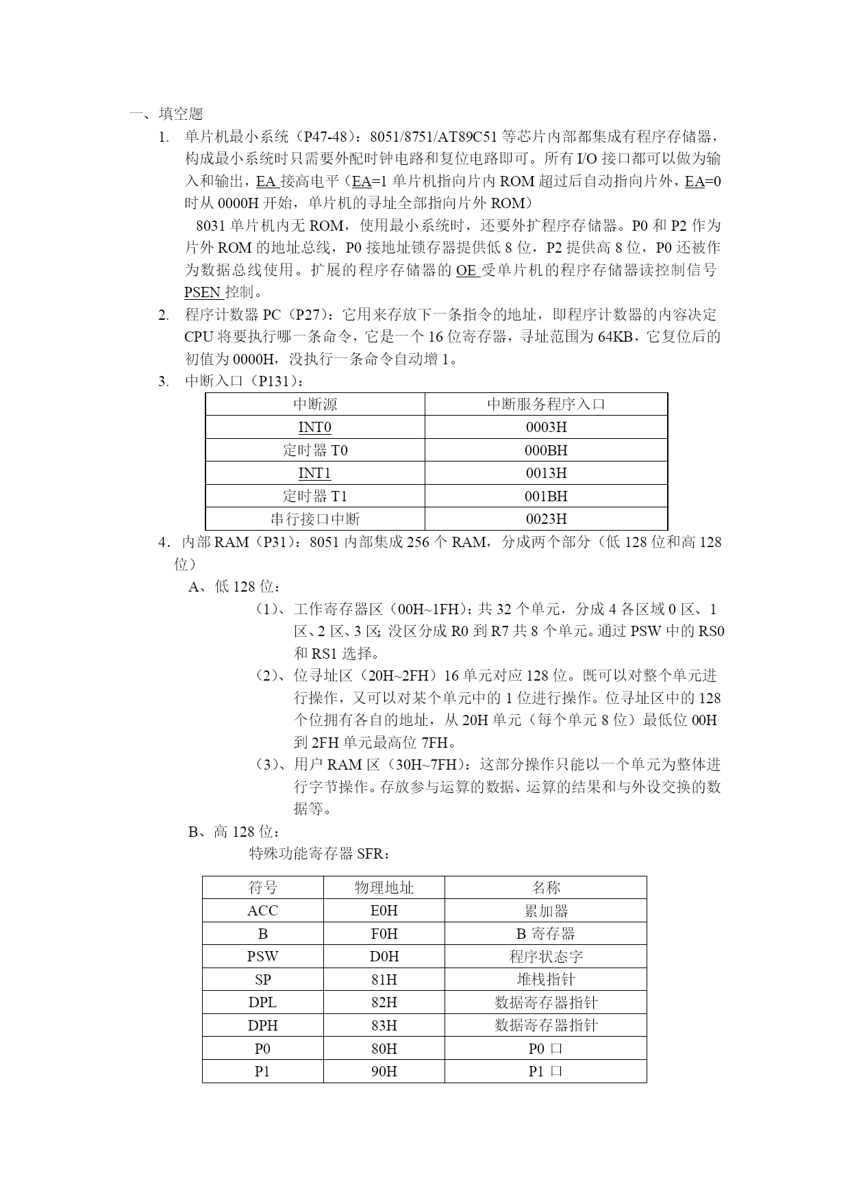 填空题单片机最小系统(P47-48):8051/8751/AT89C51等芯片内部都集成有程序存储器,构成最小系统时只需要外配时钟电路和复位电路即可。所有I/O接口都可以做为输入和输出,EA接高电平(EA=1单片机指向片内ROM超过后自动指向片外,EA=0时从0000H开始,单片机的寻址全部指向片外ROM)8031单片机内无ROM,使用最小系统时,还要外扩程序存储器。P0和P2作为片外ROM的地址总线,P0接地址锁存器提供低8位,P2提供高8位,P0还被作为数据总线使用。扩展的程序存储器的OE受单片机的程