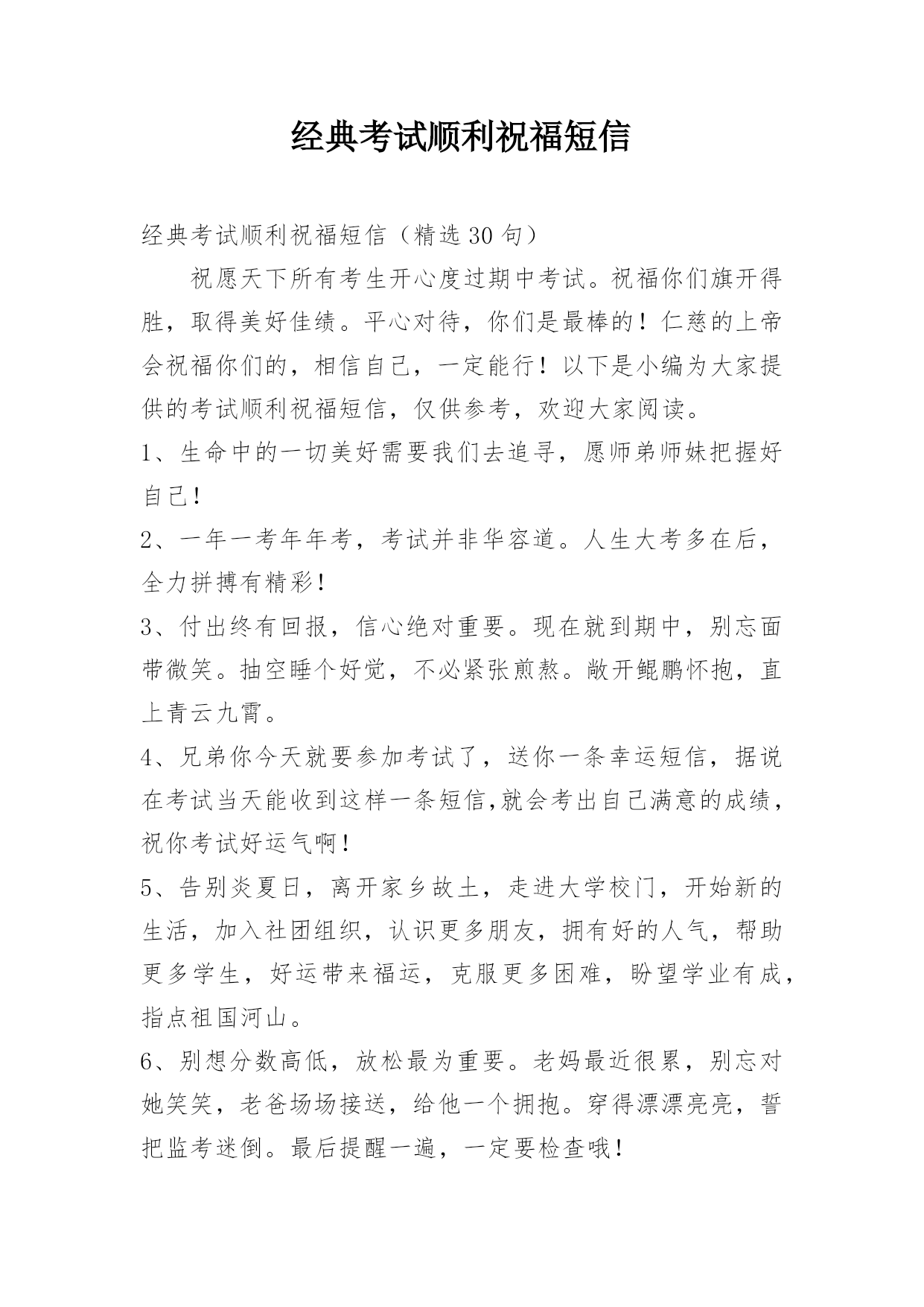 经典考试顺利祝福短信经典考试顺利祝福短信(精选30句)祝愿天下所有考生开心度过期中考试。祝福你们旗开得胜,取得美好佳绩。平心对待,你们是最棒的!仁慈的上帝会祝福你们的,相信自己,一定能行!以下是小编为大家提供的考试顺利祝福短信,仅供参考,欢迎大家阅读。1、生命中的一切美好需要我们去追寻,愿师弟师妹把握好自己!2、一年一考年年考,考试并非华容道。人生大考多在后,全力拼搏有精彩!3、付出终有回报,信心绝对重要。现在就到期中,别忘面带微笑。抽空睡个好觉,不必紧张煎熬。敞开鲲鹏怀抱,直上青云九霄。4、兄弟你今天就