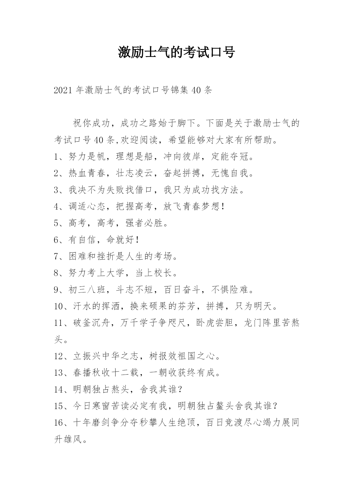 激励士气的考试口号2021年激励士气的考试口号锦集40条祝你成功,成功之路始于脚下。下面是关于激励士气的考试口号40条,欢迎阅读,希望能够对大家有所帮助。1、努力是帆,理想是船,冲向彼岸,定能夺冠。2、热血青春,壮志凌云,奋起拼搏,无愧自我。3、我决不为失败找借口,我只为成功找方法。4、调适心态,把握高考,放飞青春梦想!5、高考,高考,强者必胜。6、有自信,命就好!7、困难和挫折是人生的考场。8、努力考上大学,当上校长。9、初三八班,斗志不短,百日奋斗,不惧险难。10、汗水的挥洒,换来硕果的芬芳,拼搏,只