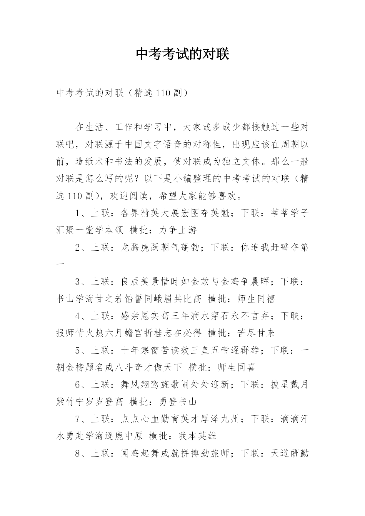 中考考试的对联中考考试的对联(精选110副)在生活、工作和学习中,大家或多或少都接触过一些对联吧,对联源于中国文字语音的对称性,出现应该在周朝以前,造纸术和书法的发展,使对联成为独立文体。那么一般对联是怎么写的呢?以下是小编整理的中考考试的对联(精选110副),欢迎阅读,希望大家能够喜欢。1、上联:各界精英大展宏图夺英魁;下联:莘莘学子汇聚一堂学本领横批:力争上游2、上联:龙腾虎跃朝气蓬勃;下联:你追我赶誓夺第一3、上联:良辰美景惜时如金敢与金鸡争晨晖;下联:书山学海甘之若饴誓同峨眉共比高横批:师生同禧4