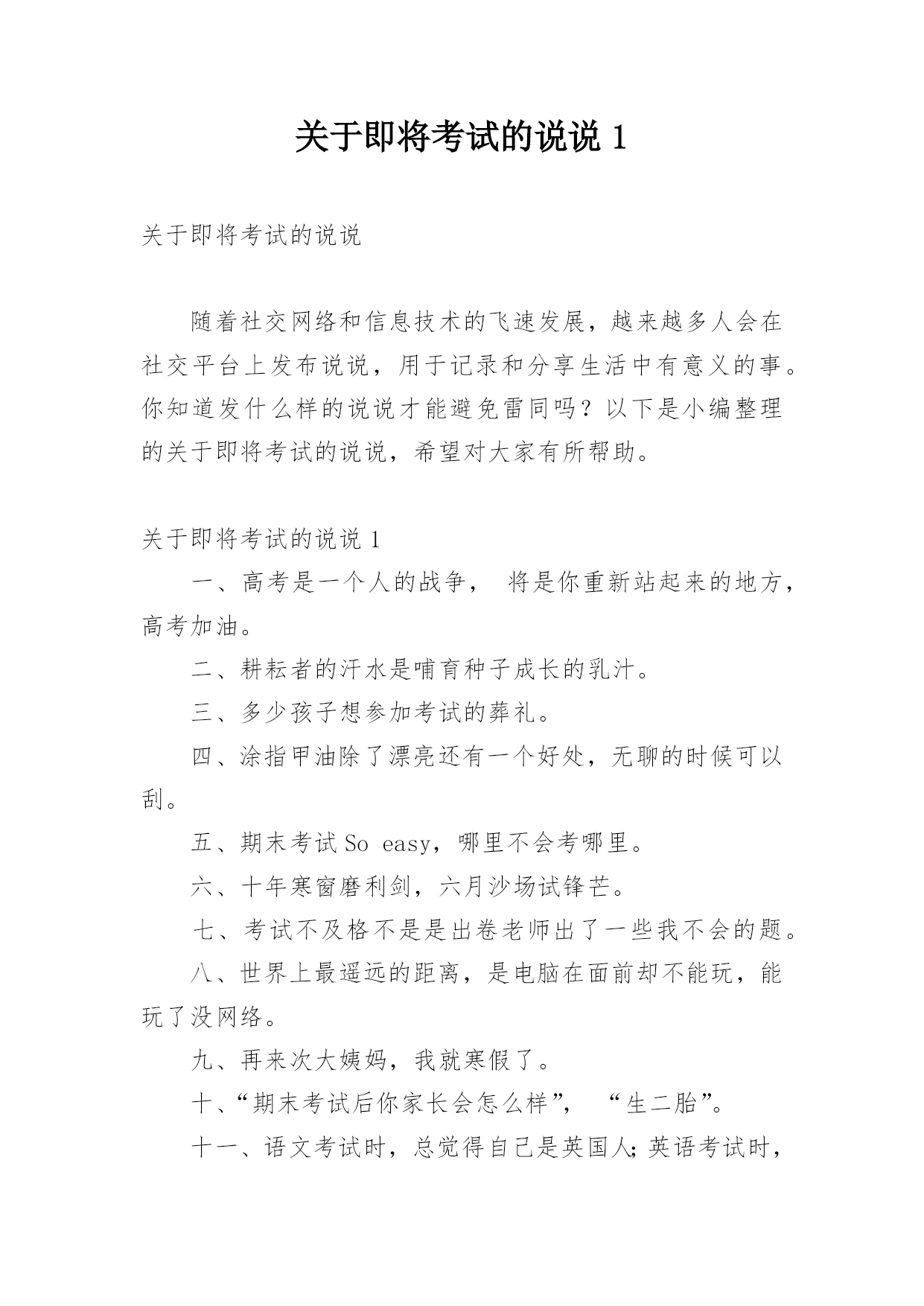 关于即将考试的说说1关于即将考试的说说随着社交网络和信息技术的飞速发展,越来越多人会在社交平台上发布说说,用于记录和分享生活中有意义的事。你知道发什么样的说说才能避免雷同吗?以下是小编整理的关于即将考试的说说,希望对大家有所帮助。关于即将考试的说说1一、高考是一个人的战争,将是你重新站起来的地方,高考加油。二、耕耘者的汗水是哺育种子成长的乳汁。三、多少孩子想参加考试的葬礼。四、涂指甲油除了漂亮还有一个好处,无聊的时候可以刮。五、期末考试Soeasy,哪里不会考哪里。六、十年寒窗磨利剑,六月沙场试锋芒。七、