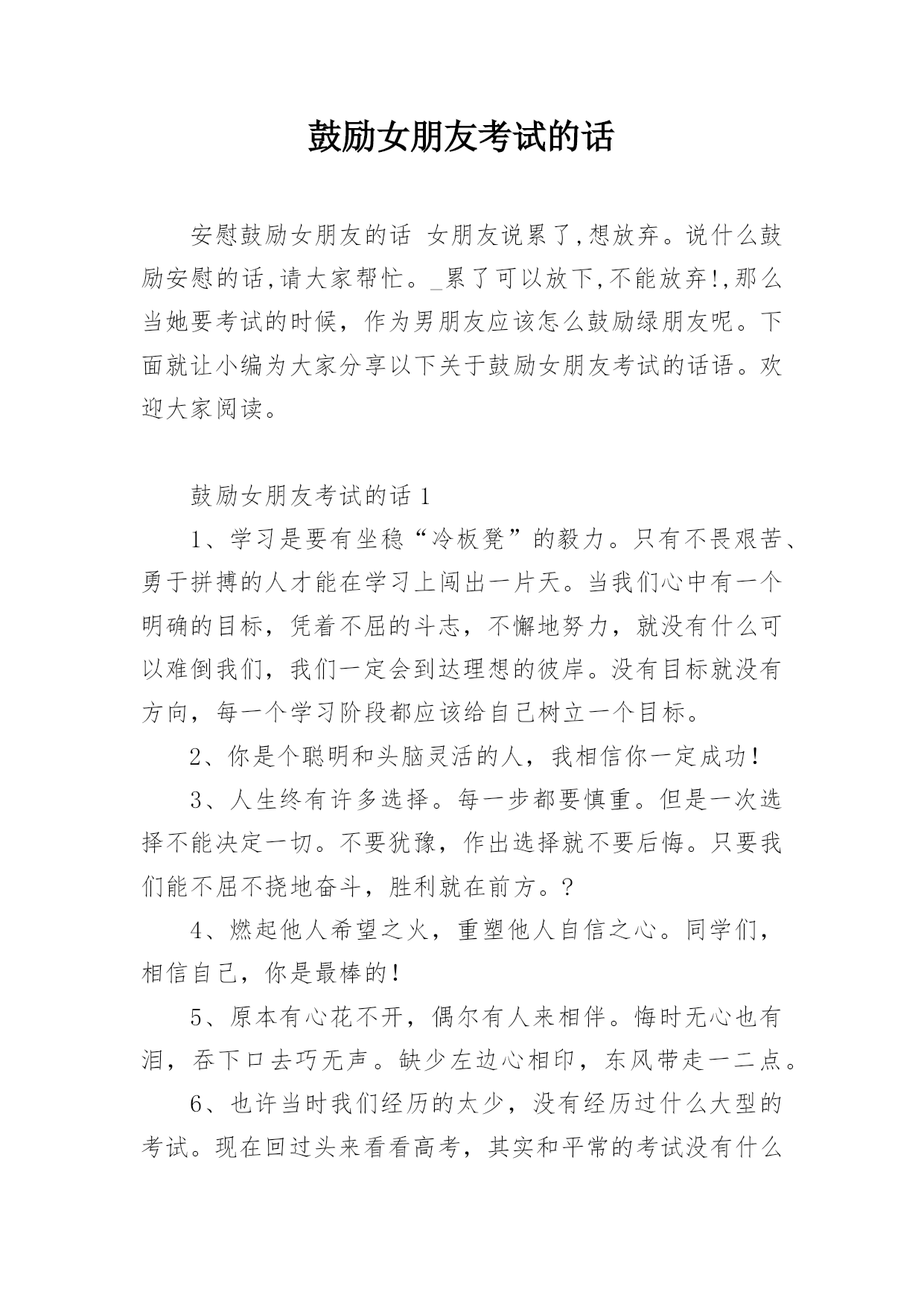 鼓励女朋友考试的话安慰鼓励女朋友的话女朋友说累了,想放弃。说什么鼓励安慰的话,请大家帮忙。_累了可以放下,不能放弃!,那么当她要考试的时候,作为男朋友应该怎么鼓励绿朋友呢。下面就让小编为大家分享以下关于鼓励女朋友考试的话语。欢迎大家阅读。鼓励女朋友考试的话11、学习是要有坐稳“冷板凳”的毅力。只有不畏艰苦、勇于拼搏的人才能在学习上闯出一片天。当我们心中有一个明确的目标,凭着不屈的斗志,不懈地努力,就没有什么可以难倒我们,我们一定会到达理想的彼岸。没有目标就没有方向,每一个学习阶段都应该给自己树立一个目标。