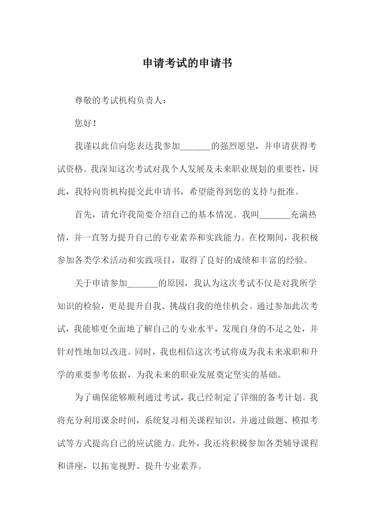 申请考试的申请书尊敬的考试机构负责人:您好!我谨以此信向您表达我参加_______的强烈愿望,并申请获得考试资格。我深知这次考试对我个人发展及未来职业规划的重要性,因此,我特向贵机构提交此申请书,希望能得到您的支持与批准。首先,请允许我简要介绍自己的基本情况。我叫_______充满热情,并一直努力提升自己的专业素养和实践能力。在校期间,我积极参加各类学术活动和实践项目,取得了良好的成绩和丰富的经验。关于申请参加_______的原因,我认为这次考试不仅是对我所学知识的检验,更是提升自我、挑战自我的绝佳机会。