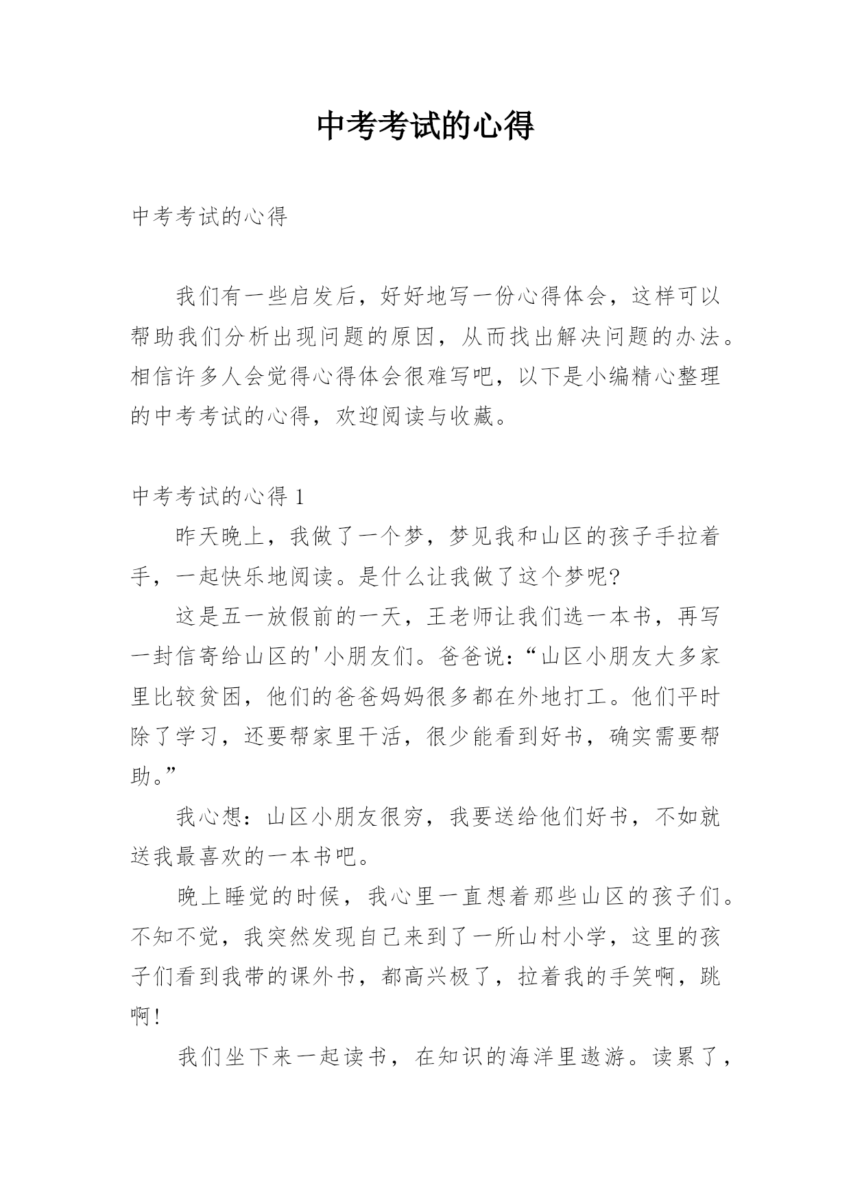 中考考试的心得中考考试的心得我们有一些启发后,好好地写一份心得体会,这样可以帮助我们分析出现问题的原因,从而找出解决问题的办法。相信许多人会觉得心得体会很难写吧,以下是小编精心整理的中考考试的心得,欢迎阅读与收藏。中考考试的心得1昨天晚上,我做了一个梦,梦见我和山区的孩子手拉着手,一起快乐地阅读。是什么让我做了这个梦呢?这是五一放假前的一天,王老师让我们选一本书,再写一封信寄给山区的'小朋友们。爸爸说:“山区小朋友大多家里比较贫困,他们的爸爸妈妈很多都在外地打工。他们平时除了学习,还要帮家里干活,很少能看