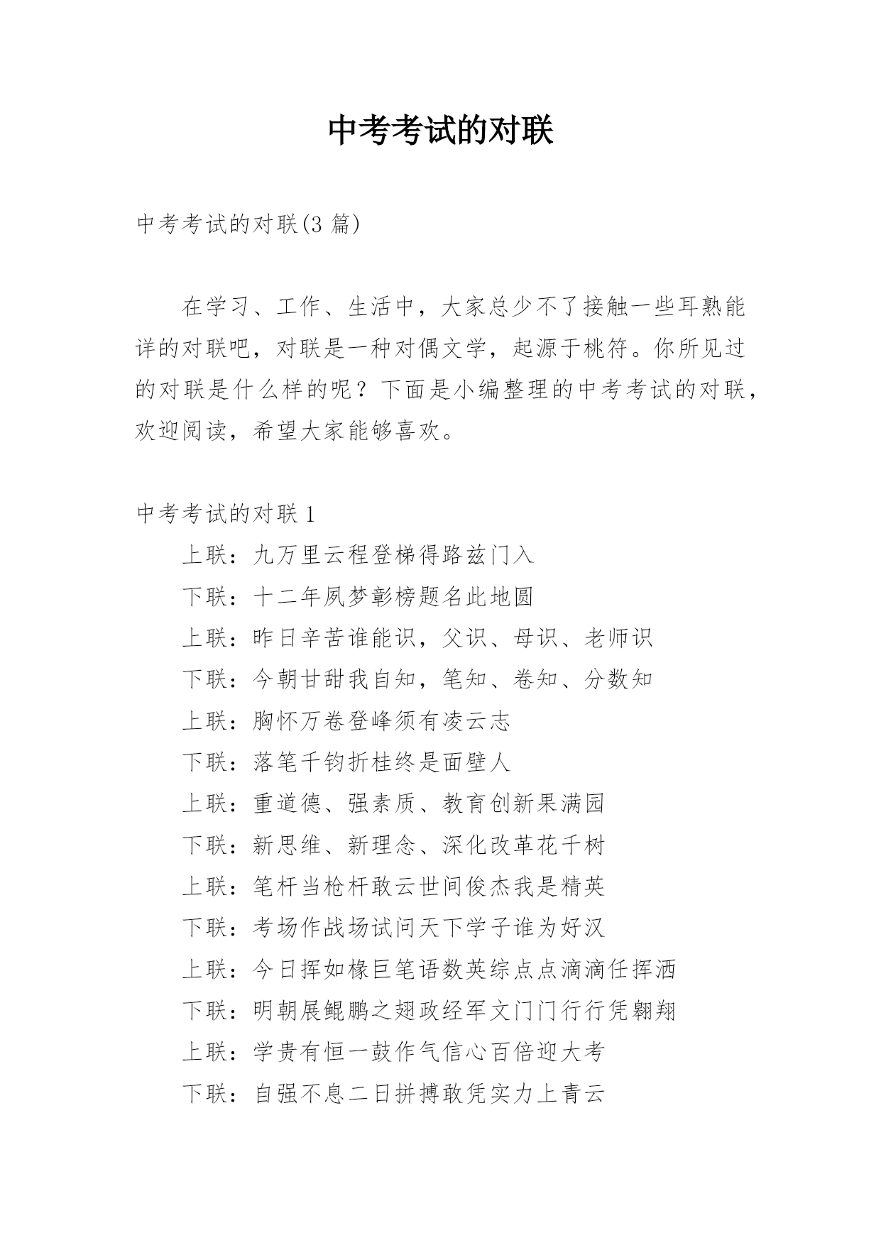 中考考试的对联中考考试的对联(3篇)在学习、工作、生活中,大家总少不了接触一些耳熟能详的对联吧,对联是一种对偶文学,起源于桃符。你所见过的对联是什么样的呢?下面是小编整理的中考考试的对联,欢迎阅读,希望大家能够喜欢。中考考试的对联1上联:九万里云程登梯得路兹门入下联:十二年夙梦彰榜题名此地圆上联:昨日辛苦谁能识,父识、母识、老师识下联:今朝甘甜我自知,笔知、卷知、分数知上联:胸怀万卷登峰须有凌云志下联:落笔千钧折桂终是面壁人上联:重道德、强素质、教育创新果满园下联:新思维、新理念、深化改革花千树上联:笔杆