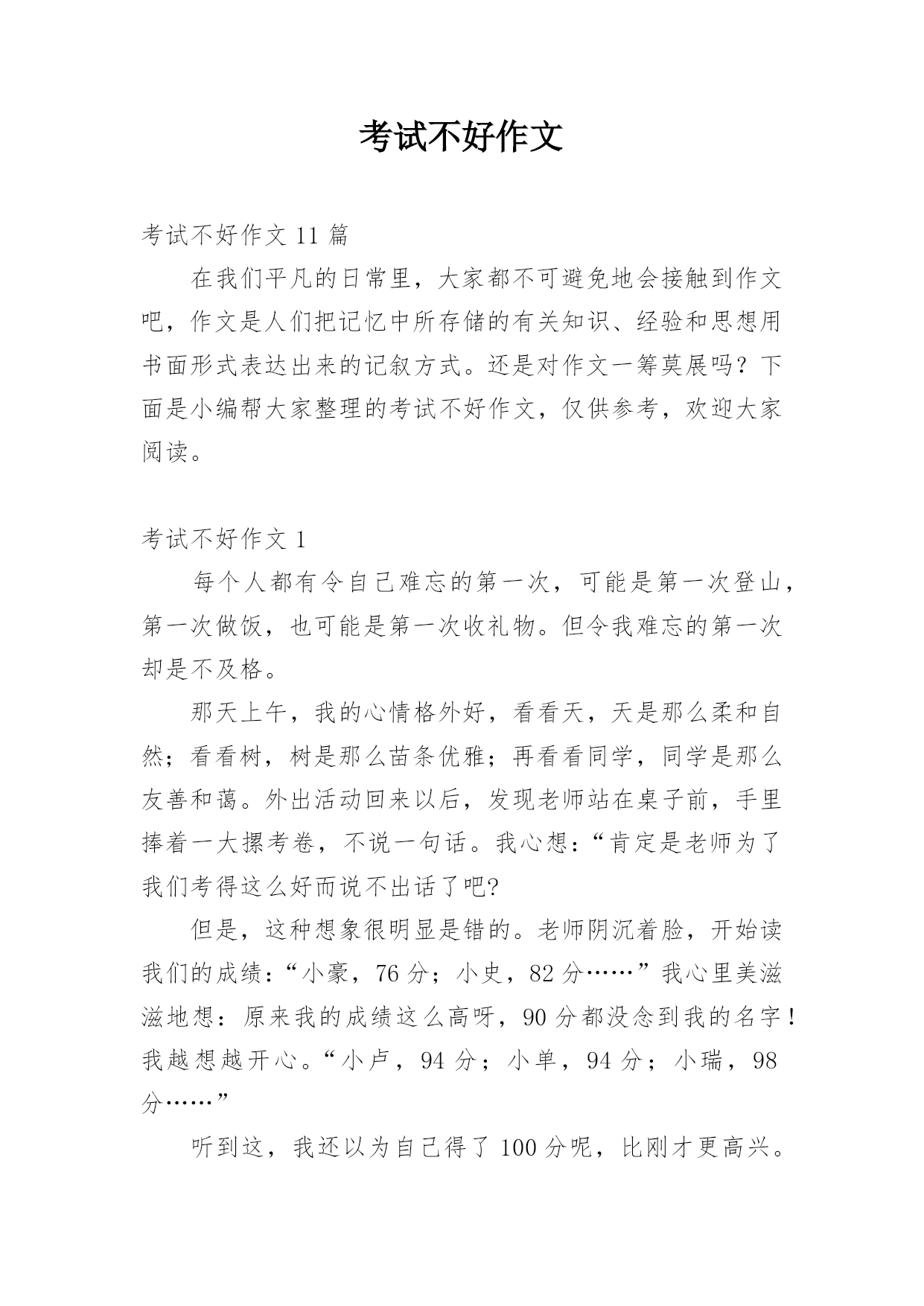 考试不好作文考试不好作文11篇在我们平凡的日常里,大家都不可避免地会接触到作文吧,作文是人们把记忆中所存储的有关知识、经验和思想用书面形式表达出来的记叙方式。还是对作文一筹莫展吗?下面是小编帮大家整理的考试不好作文,仅供参考,欢迎大家阅读。考试不好作文1每个人都有令自己难忘的第一次,可能是第一次登山,第一次做饭,也可能是第一次收礼物。但令我难忘的第一次却是不及格。那天上午,我的心情格外好,看看天,天是那么柔和自然;看看树,树是那么苗条优雅;再看看同学,同学是那么友善和蔼。外出活动回来以后,发现老师站在桌子