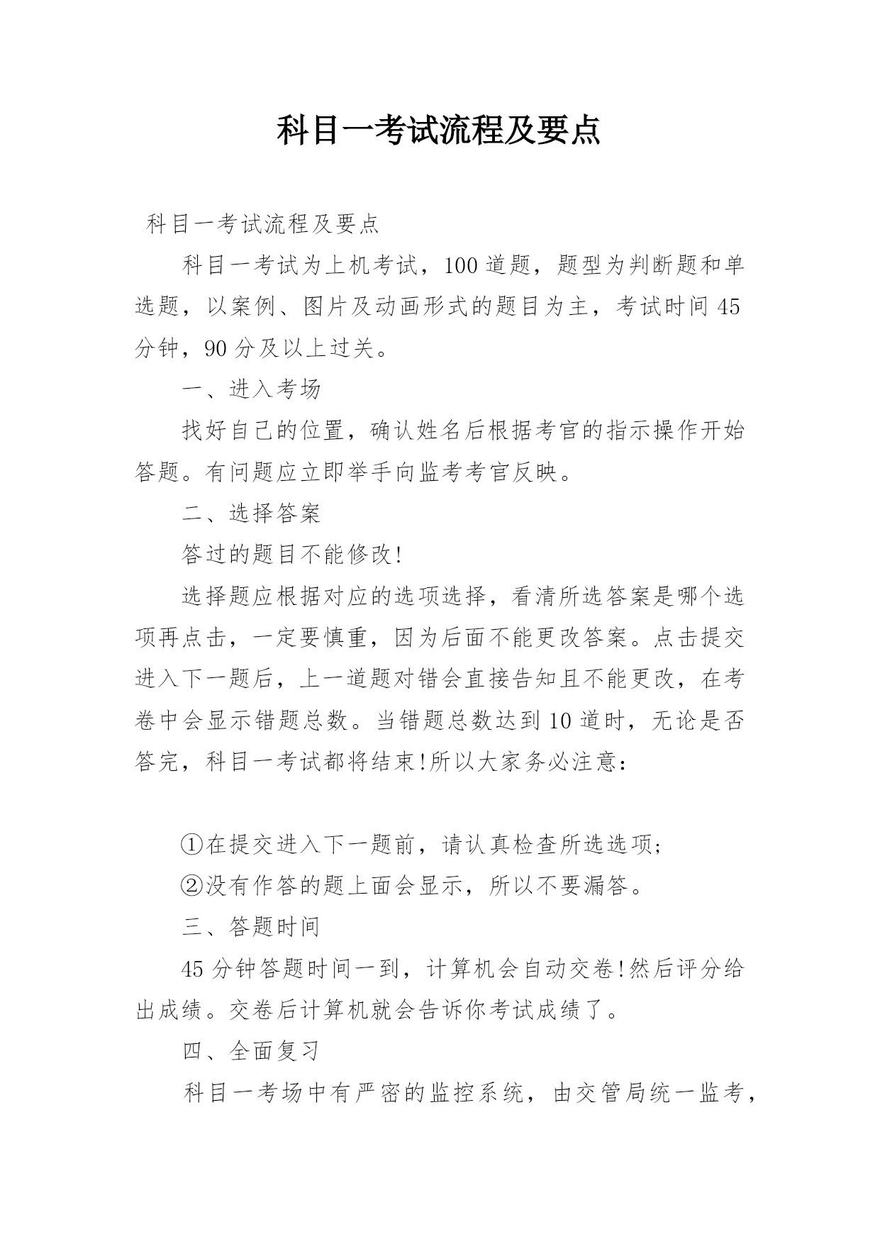 科目一考试流程及要点科目一考试流程及要点科目一考试为上机考试,100道题,题型为判断题和单选题,以案例、图片及动画形式的题目为主,考试时间45分钟,90分及以上过关。一、进入考场找好自己的位置,确认姓名后根据考官的指示操作开始答题。有问题应立即举手向监考考官反映。二、选择答案答过的题目不能修改!选择题应根据对应的选项选择,看清所选答案是哪个选项再点击,一定要慎重,因为后面不能更改答案。点击提交进入下一题后,上一道题对错会直接告知且不能更改,在考卷中会显示错题总数。当错题总数达到10道时,无论是否答完,科目
