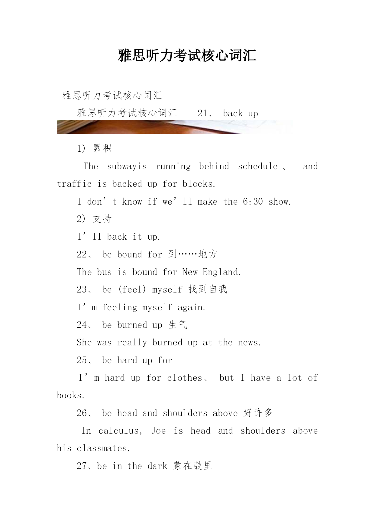 雅思听力考试核心词汇雅思听力考试核心词汇雅思听力考试核心词汇21、backup1)累积Thesubwayisrunningbehindschedule、andtrafficisbackedupforblocks.Idon’tknowifwe’llmakethe6:30show.2)支持I’llbackitup.22、beboundfor到……地方ThebusisboundforNewEngland.23、be(feel)myself找到自我I’mfeelingmyselfagain.24、beburned