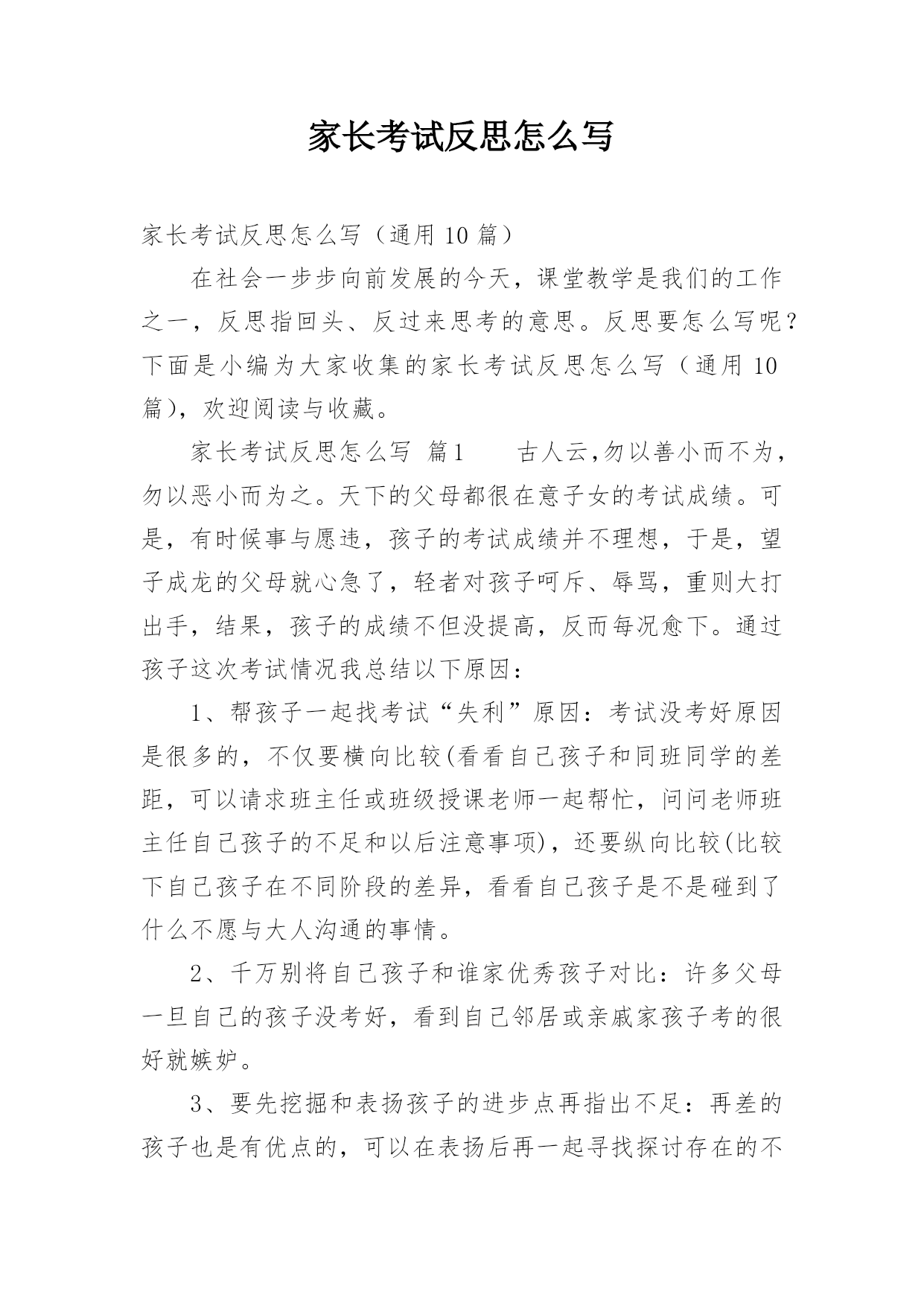 家长考试反思怎么写家长考试反思怎么写(通用10篇)在社会一步步向前发展的今天,课堂教学是我们的工作之一,反思指回头、反过来思考的意思。反思要怎么写呢?下面是小编为大家收集的家长考试反思怎么写(通用10篇),欢迎阅读与收藏。家长考试反思怎么写篇1古人云,勿以善小而不为,勿以恶小而为之。天下的父母都很在意子女的考试成绩。可是,有时候事与愿违,孩子的考试成绩并不理想,于是,望子成龙的父母就心急了,轻者对孩子呵斥、辱骂,重则大打出手,结果,孩子的成绩不但没提高,反而每况愈下。通过孩子这次考试情况我总结以下原因:1