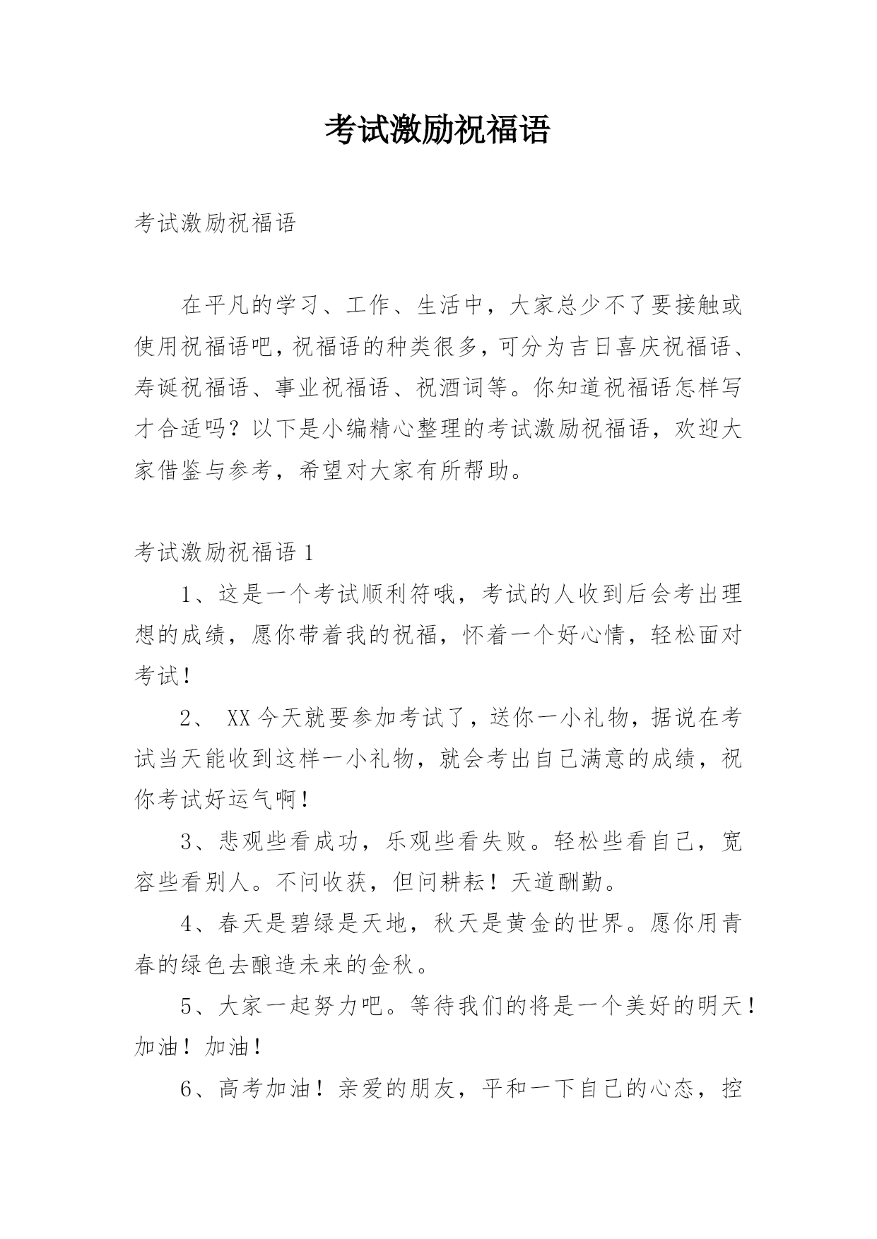 考试激励祝福语考试激励祝福语在平凡的学习、工作、生活中,大家总少不了要接触或使用祝福语吧,祝福语的种类很多,可分为吉日喜庆祝福语、寿诞祝福语、事业祝福语、祝酒词等。你知道祝福语怎样写才合适吗?以下是小编精心整理的考试激励祝福语,欢迎大家借鉴与参考,希望对大家有所帮助。考试激励祝福语11、这是一个考试顺利符哦,考试的人收到后会考出理想的成绩,愿你带着我的祝福,怀着一个好心情,轻松面对考试!2、XX今天就要参加考试了,送你一小礼物,据说在考试当天能收到这样一小礼物,就会考出自己满意的成绩,祝你考试好运气啊!3