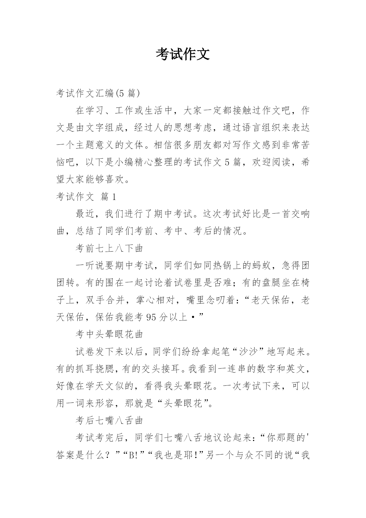 考试作文考试作文汇编(5篇)在学习、工作或生活中,大家一定都接触过作文吧,作文是由文字组成,经过人的思想考虑,通过语言组织来表达一个主题意义的文体。相信很多朋友都对写作文感到非常苦恼吧,以下是小编精心整理的考试作文5篇,欢迎阅读,希望大家能够喜欢。考试作文篇1最近,我们进行了期中考试。这次考试好比是一首交响曲,总结了同学们考前、考中、考后的情况。考前七上八下曲一听说要期中考试,同学们如同热锅上的蚂蚁,急得团团转。有的围在一起讨论着试卷里是否难;有的盘腿坐在椅子上,双手合并,掌心相对,嘴里念叨着:“老天保佑