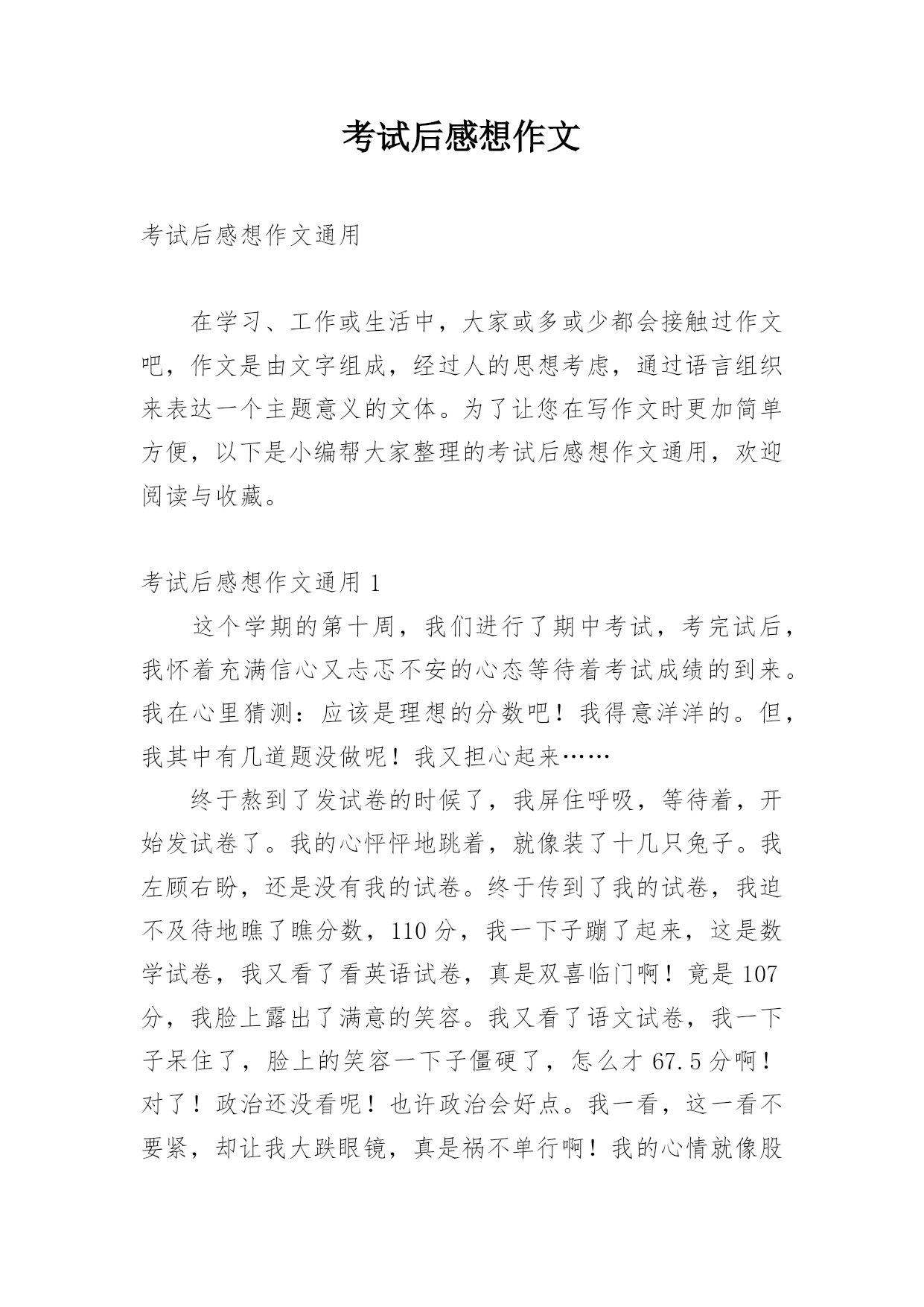 考试后感想作文考试后感想作文通用在学习、工作或生活中,大家或多或少都会接触过作文吧,作文是由文字组成,经过人的思想考虑,通过语言组织来表达一个主题意义的文体。为了让您在写作文时更加简单方便,以下是小编帮大家整理的考试后感想作文通用,欢迎阅读与收藏。考试后感想作文通用1这个学期的第十周,我们进行了期中考试,考完试后,我怀着充满信心又忐忑不安的心态等待着考试成绩的到来。我在心里猜测:应该是理想的分数吧!我得意洋洋的。但,我其中有几道题没做呢!我又担心起来……终于熬到了发试卷的时候了,我屏住呼吸,等待着,开始发