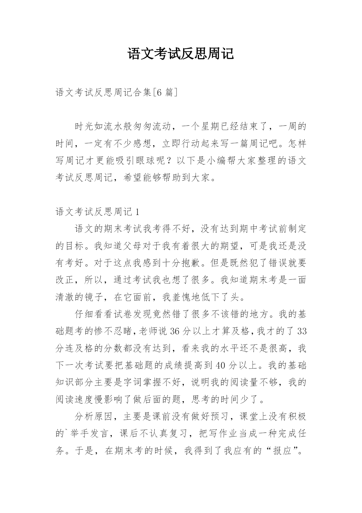 语文考试反思周记语文考试反思周记合集[6篇]时光如流水般匆匆流动,一个星期已经结束了,一周的时间,一定有不少感想,立即行动起来写一篇周记吧。怎样写周记才更能吸引眼球呢?以下是小编帮大家整理的语文考试反思周记,希望能够帮助到大家。语文考试反思周记1语文的期末考试我考得不好,没有达到期中考试前制定的目标。我知道父母对于我有着很大的期望,可是我还是没有考好。对于这点我感到十分抱歉。但是既然犯了错误就要改正,所以,通过考试我也想了很多。我知道期末考是一面清澈的镜子,在它面前,我羞愧地低下了头。仔细看看试卷发现竟然