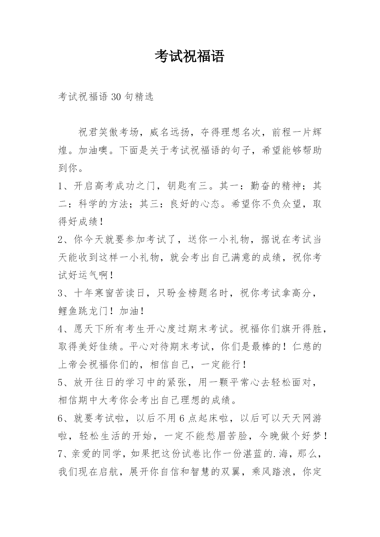 考试祝福语考试祝福语30句精选祝君笑傲考场,威名远扬,夺得理想名次,前程一片辉煌。加油噢。下面是关于考试祝福语的句子,希望能够帮助到你。1、开启高考成功之门,钥匙有三。其一:勤奋的精神;其二:科学的方法;其三:良好的心态。希望你不负众望,取得好成绩!2、你今天就要参加考试了,送你一小礼物,据说在考试当天能收到这样一小礼物,就会考出自己满意的成绩,祝你考试好运气啊!3、十年寒窗苦读日,只盼金榜题名时,祝你考试拿高分,鲤鱼跳龙门!加油!4、愿天下所有考生开心度过期末考试。祝福你们旗开得胜,取得美好佳绩。平心对