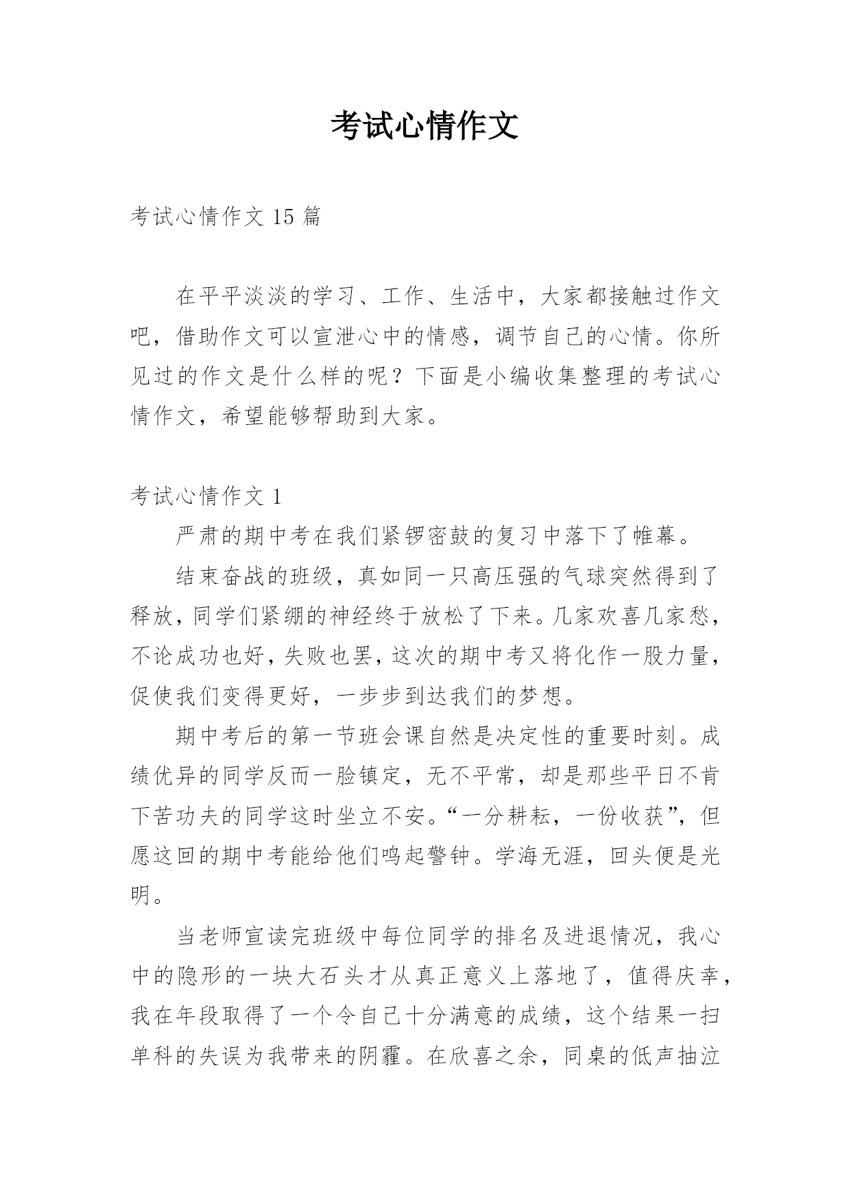 考试心情作文考试心情作文15篇在平平淡淡的学习、工作、生活中,大家都接触过作文吧,借助作文可以宣泄心中的情感,调节自己的心情。你所见过的作文是什么样的呢?下面是小编收集整理的考试心情作文,希望能够帮助到大家。考试心情作文1严肃的期中考在我们紧锣密鼓的复习中落下了帷幕。结束奋战的班级,真如同一只高压强的气球突然得到了释放,同学们紧绷的神经终于放松了下来。几家欢喜几家愁,不论成功也好,失败也罢,这次的期中考又将化作一股力量,促使我们变得更好,一步步到达我们的梦想。期中考后的第一节班会课自然是决定性的重要时刻。