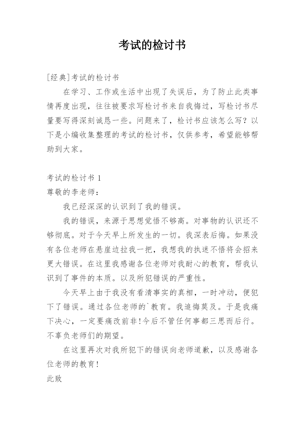 考试的检讨书[经典]考试的检讨书在学习、工作或生活中出现了失误后,为了防止此类事情再度出现,往往被要求写检讨书来自我悔过,写检讨书尽量要写得深刻诚恳一些。问题来了,检讨书应该怎么写?以下是小编收集整理的考试的检讨书,仅供参考,希望能够帮助到大家。考试的检讨书1尊敬的李老师:我已经深深的认识到了我的错误。我的错误,来源于思想觉悟不够高。对事物的认识还不够彻底。对于今天早上所发生的一切。我深表后悔。如果没有各位老师在悬崖边拉我一把,我想我的执迷不悟将会招来更大错误。在这里我感谢各位老师对我耐心的教育,帮我认识