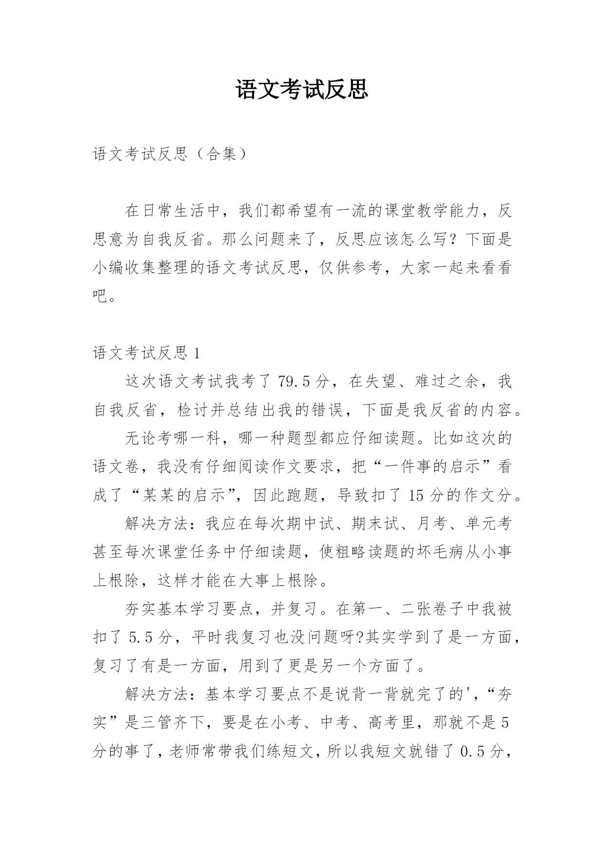 语文考试反思语文考试反思(合集)在日常生活中,我们都希望有一流的课堂教学能力,反思意为自我反省。那么问题来了,反思应该怎么写?下面是小编收集整理的语文考试反思,仅供参考,大家一起来看看吧。语文考试反思1这次语文考试我考了79.5分,在失望、难过之余,我自我反省,检讨并总结出我的错误,下面是我反省的内容。无论考哪一科,哪一种题型都应仔细读题。比如这次的语文卷,我没有仔细阅读作文要求,把“一件事的启示”看成了“某某的启示”,因此跑题,导致扣了15分的作文分。解决方法:我应在每次期中试、期末试、月考、单元考甚至