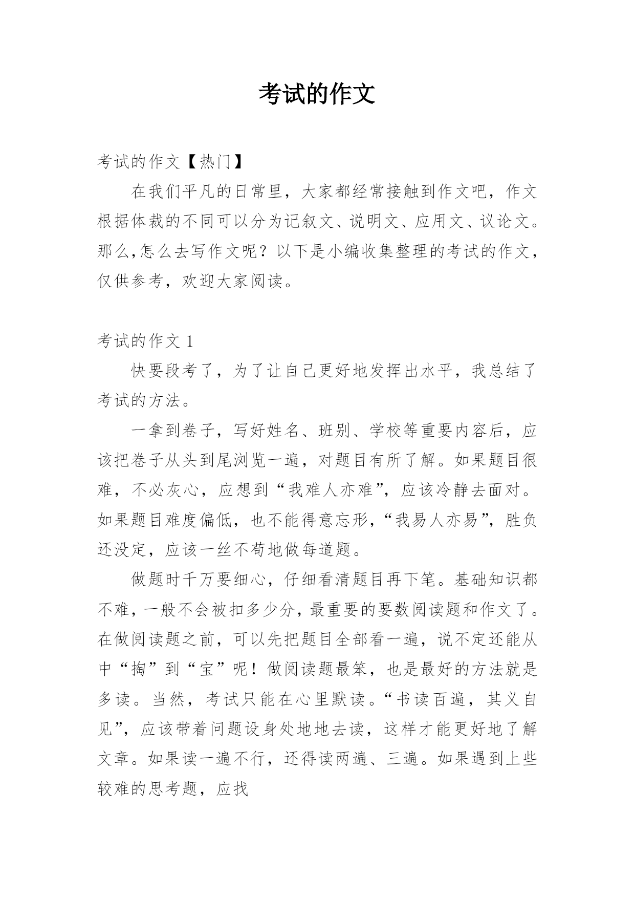 考试的作文考试的作文【热门】在我们平凡的日常里,大家都经常接触到作文吧,作文根据体裁的不同可以分为记叙文、说明文、应用文、议论文。那么,怎么去写作文呢?以下是小编收集整理的考试的作文,仅供参考,欢迎大家阅读。考试的作文1快要段考了,为了让自己更好地发挥出水平,我总结了考试的方法。一拿到卷子,写好姓名、班别、学校等重要内容后,应该把卷子从头到尾浏览一遍,对题目有所了解。如果题目很难,不必灰心,应想到“我难人亦难”,应该冷静去面对。如果题目难度偏低,也不能得意忘形,“我易人亦易”,胜负还没定,应该一丝不苟地做