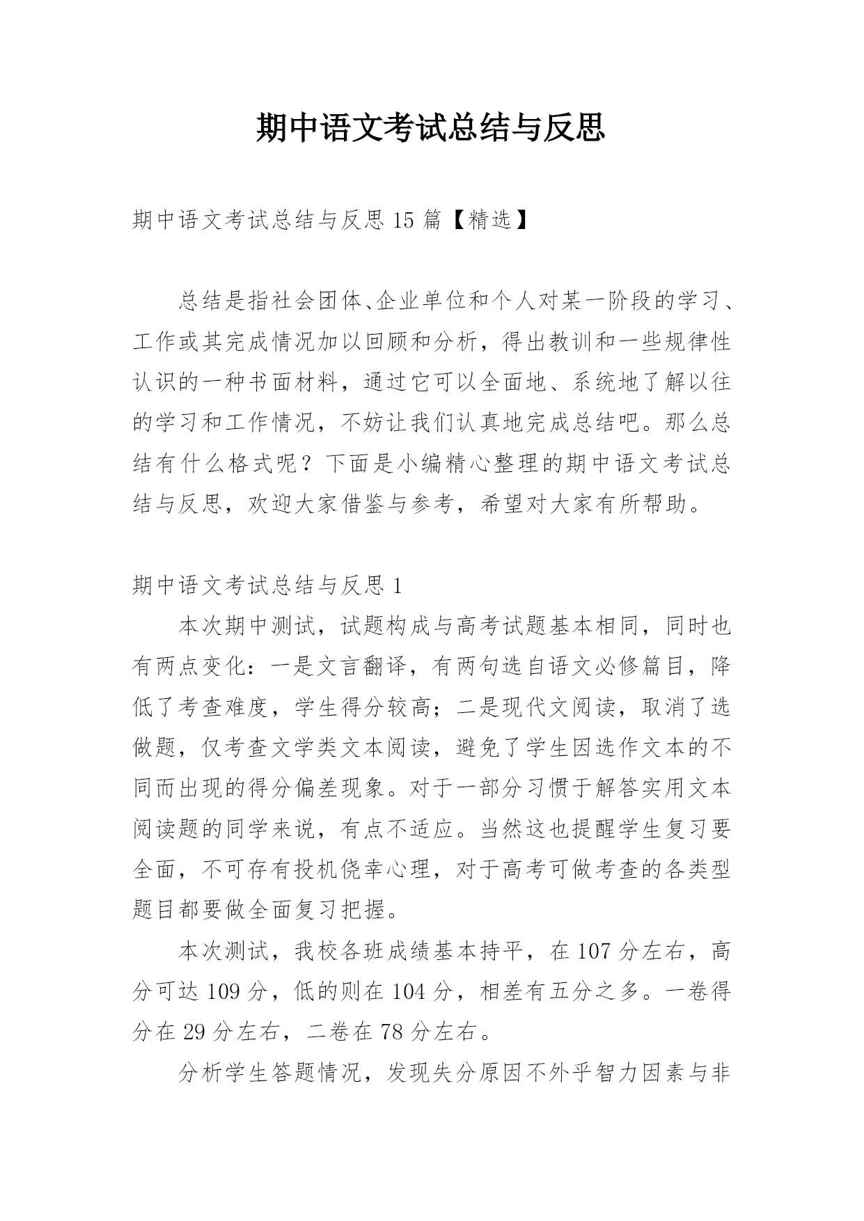 期中语文考试总结与反思期中语文考试总结与反思15篇【精选】总结是指社会团体、企业单位和个人对某一阶段的学习、工作或其完成情况加以回顾和分析,得出教训和一些规律性认识的一种书面材料,通过它可以全面地、系统地了解以往的学习和工作情况,不妨让我们认真地完成总结吧。那么总结有什么格式呢?下面是小编精心整理的期中语文考试总结与反思,欢迎大家借鉴与参考,希望对大家有所帮助。期中语文考试总结与反思1本次期中测试,试题构成与高考试题基本相同,同时也有两点变化:一是文言翻译,有两句选自语文必修篇目,降低了考查难度,学生得分