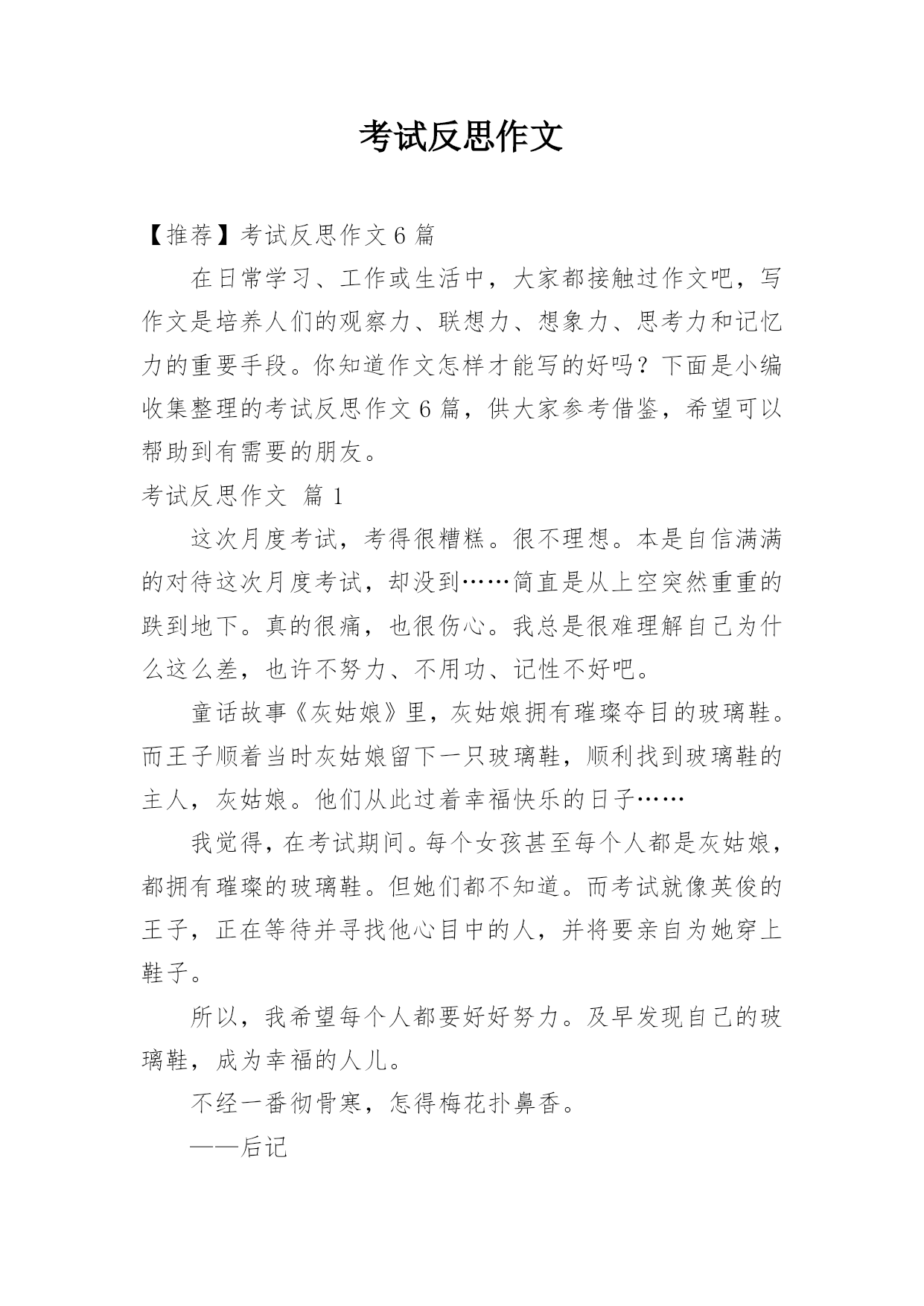 考试反思作文【推荐】考试反思作文6篇在日常学习、工作或生活中,大家都接触过作文吧,写作文是培养人们的观察力、联想力、想象力、思考力和记忆力的重要手段。你知道作文怎样才能写的好吗?下面是小编收集整理的考试反思作文6篇,供大家参考借鉴,希望可以帮助到有需要的朋友。考试反思作文篇1这次月度考试,考得很糟糕。很不理想。本是自信满满的对待这次月度考试,却没到……简直是从上空突然重重的跌到地下。真的很痛,也很伤心。我总是很难理解自己为什么这么差,也许不努力、不用功、记性不好吧。童话故事《灰姑娘》里,灰姑娘拥有璀璨夺目