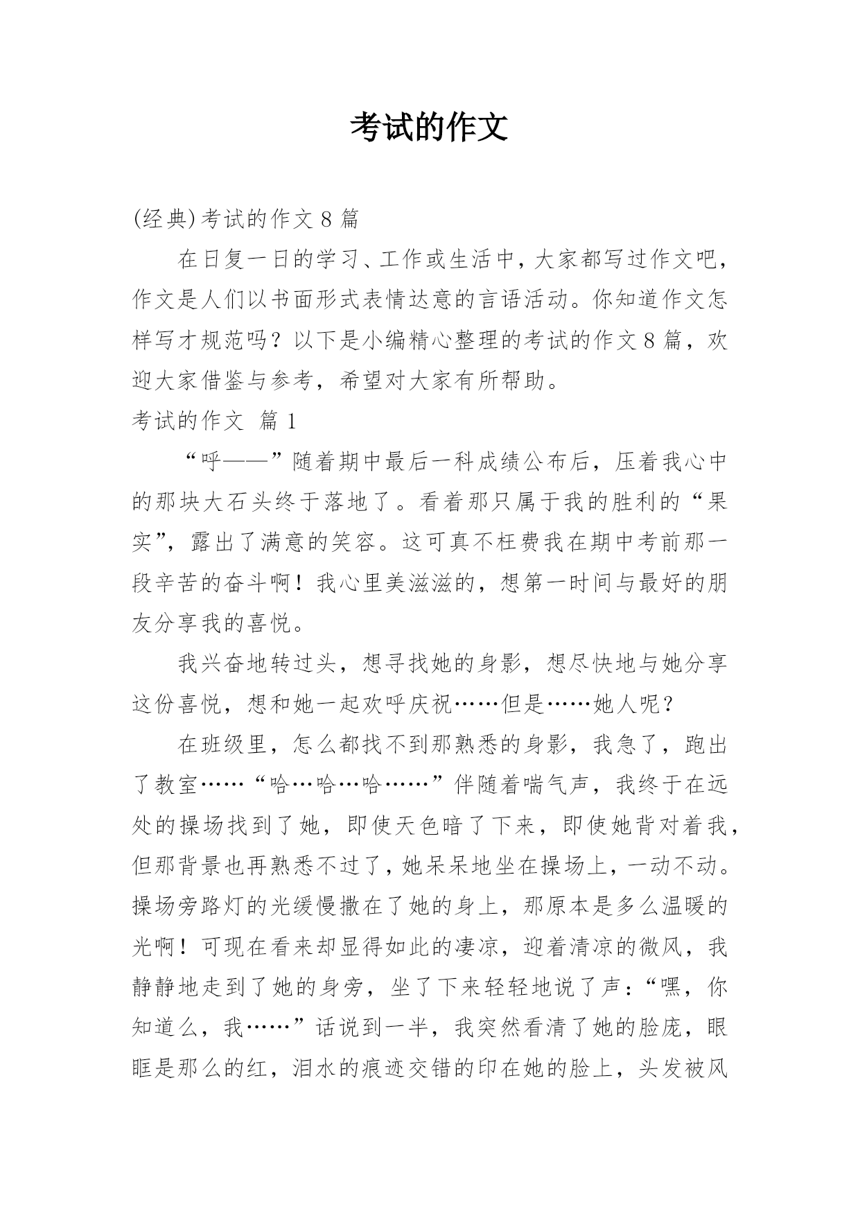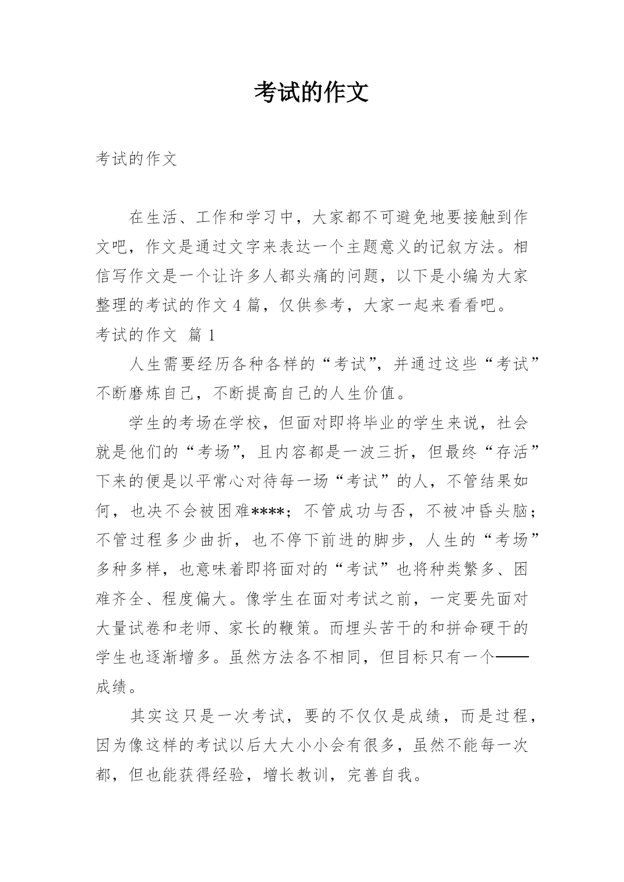 考试的作文考试的作文在生活、工作和学习中,大家都不可避免地要接触到作文吧,作文是通过文字来表达一个主题意义的记叙方法。相信写作文是一个让许多人都头痛的问题,以下是小编为大家整理的考试的作文4篇,仅供参考,大家一起来看看吧。考试的作文篇1人生需要经历各种各样的“考试”,并通过这些“考试”不断磨炼自己,不断提高自己的人生价值。学生的考场在学校,但面对即将毕业的学生来说,社会就是他们的“考场”,且内容都是一波三折,但最终“存活”下来的便是以平常心对待每一场“考试”的人,不管结果如何,也决不会被困难****;不管