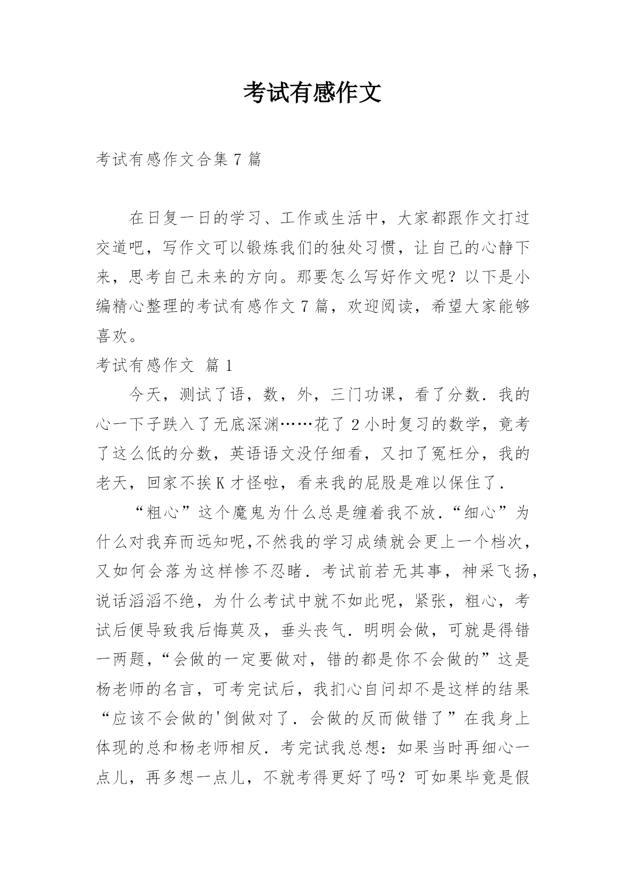 考试有感作文考试有感作文合集7篇在日复一日的学习、工作或生活中,大家都跟作文打过交道吧,写作文可以锻炼我们的独处习惯,让自己的心静下来,思考自己未来的方向。那要怎么写好作文呢?以下是小编精心整理的考试有感作文7篇,欢迎阅读,希望大家能够喜欢。考试有感作文篇1今天,测试了语,数,外,三门功课,看了分数.我的心一下子跌入了无底深渊……花了2小时复习的数学,竟考了这么低的分数,英语语文没仔细看,又扣了冤枉分,我的老天,回家不挨K才怪啦,看来我的屁股是难以保住了.“粗心”这个魔鬼为什么总是缠着我不放.“细心”为什